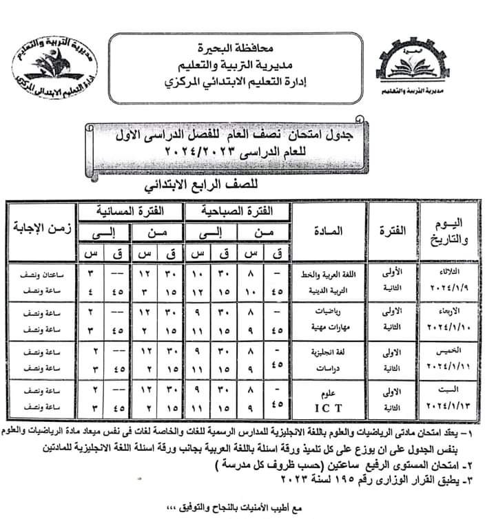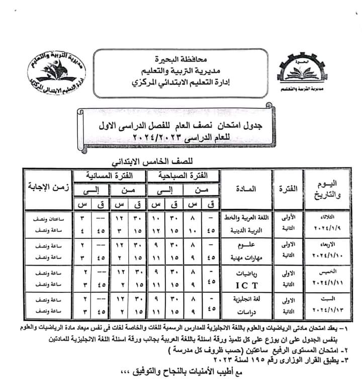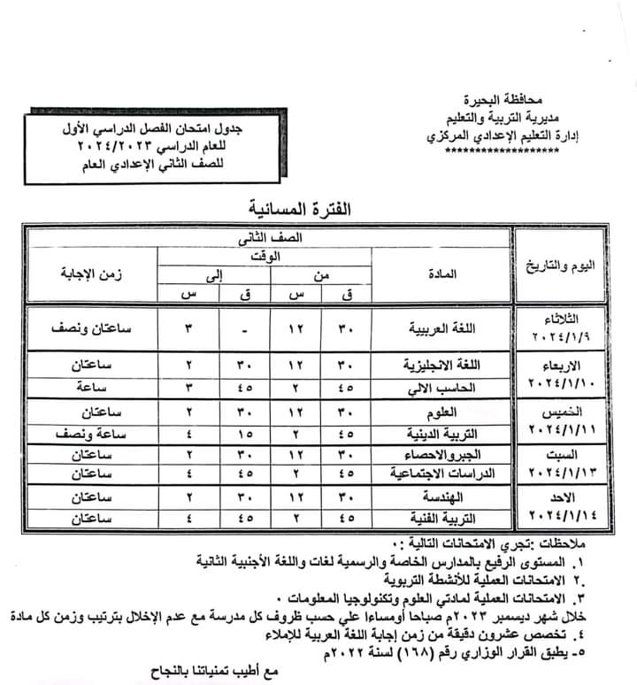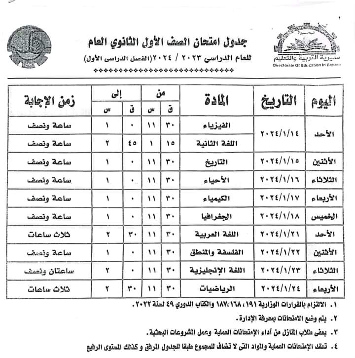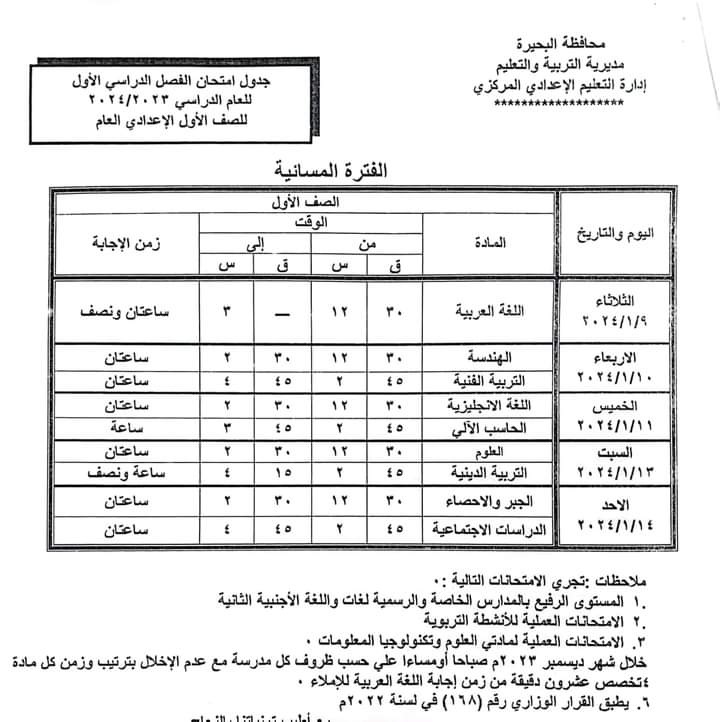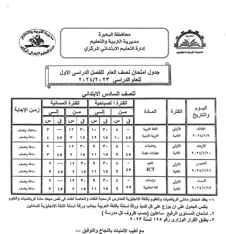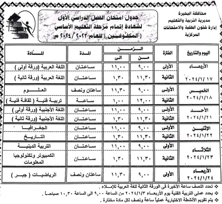 ننشر جدول امتحانات الفصل الدراسي الأول بمحافظة البحيرة