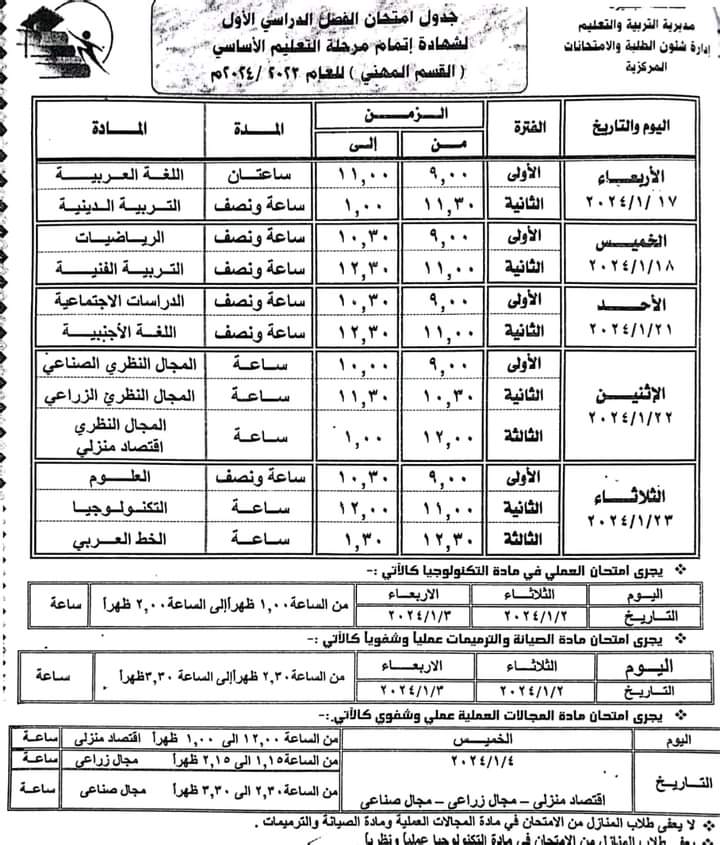 الصفوف الأول والثاني الإعدادي المهني من الثلاثاء 9 يناير 2024 وحتى الأحد 14 يناير 2024