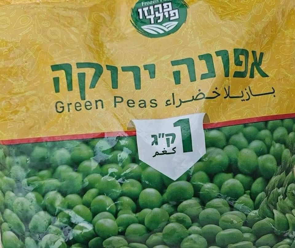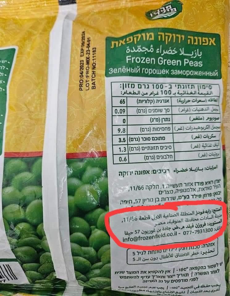 وكتب على أكياس البسلة المتداولة باللغة العبرية من إنتاج شركة راية فودز بالمنطقة الصناعية الأولى بمدينة السادات محافظة المنوفية، والمستورد هو شركة فروزن فيلد م. ض جادة بن جوريون 57 حيفا، وتظهر البيانات أن تاريخ الإنتاج هو شهر أبريل 2023، ومدة الصلاحية حتى عام 2024.