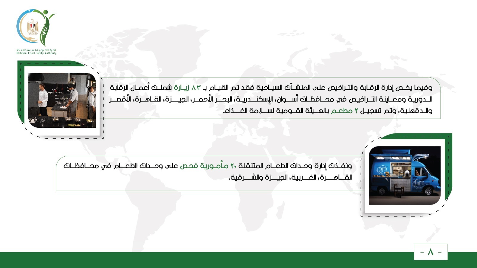 وفيما يخص إدارة الرقابة والتراخيص على المنشآت السياحية فقد تم القيام بـ 83 زيارة شملت أعمال الرقابة الدورية ومعاينة التراخيص في محافظات أسوان، الإسكندرية، البحر الأحمر، الجيزة، القاهرة، الأقصر والدقهلية، وتم تسجيل 2 مطعم بالهيئة القومية لسلامة الغذاء.