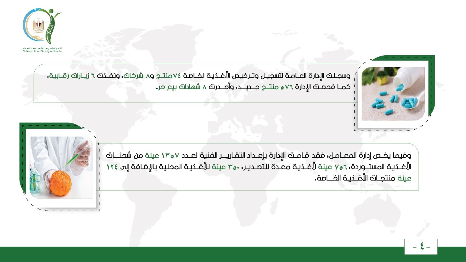 وسجلت الإدارة العامة لتسجيل وترخيص الأغذية الخاصة 74 منتج و8 شركات، ونفذت 6 زيارات رقابية، كما فحصت الإدارة 576 منتج جديد، وأصدرت 8 شهادات بيع حر.