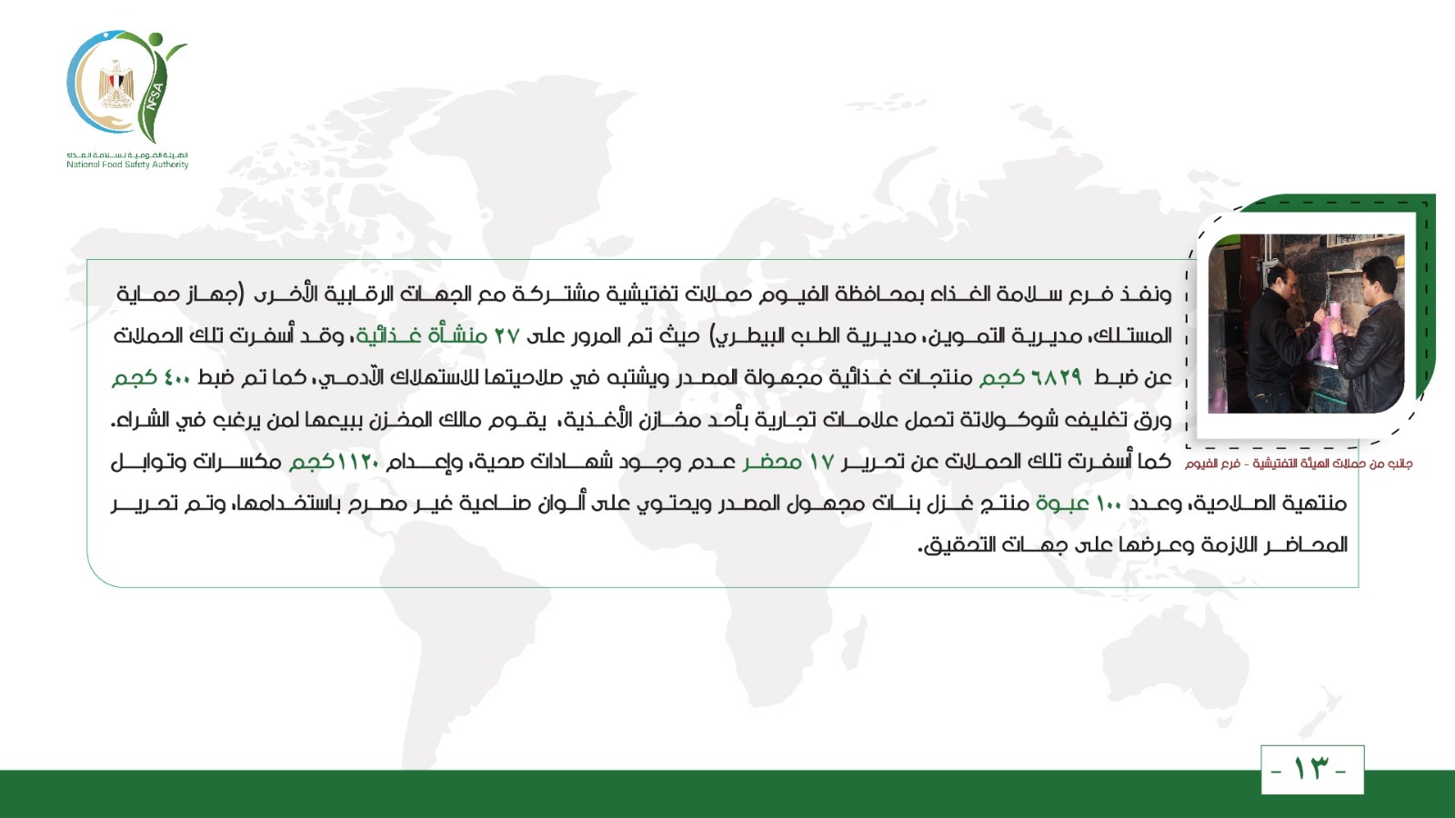 ونفذ فرع سلامة الغذاء بمحافظة الفيوم حملات تفتيشية مشتركة مع الجهات الرقابية الأخرى (جهاز حماية المستلك، مديرية التموين، مديرية الطب البيطري) حيث تم المرور على 27 منشأة غذائية، وقد أسفرت تلك الحملات عن ضبط 6829 كجم منتجات غذائية مجهولة المصدر ويشتبه في صلاحيتها للاستهلاك الآدمي، كما تم ضبط 400 كجم ورق تغليف شوكولاتة تحمل علامات تجارية بأحد مخازن الأغذية، يقوم مالك المخزن ببيعها لمن يرغب في الشراء.