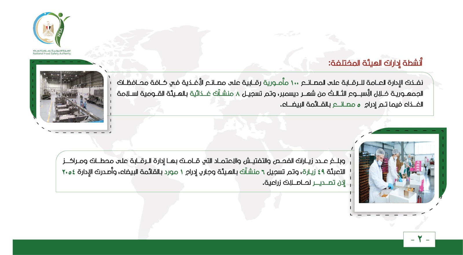 نفذت الإدارة العامة للرقابة على المصانع 100 مأمورية رقابية على مصانع الأغذية في كافة محافظات الجمهورية خلال الأسبوع الثالث من شهر ديسمبر، وتم تسجيل 8 منشآت غذائية بالهيئة القومية لسلامة الغذاء فيما تم إدراج 5 مصانع بالقائمة البيضاء.
