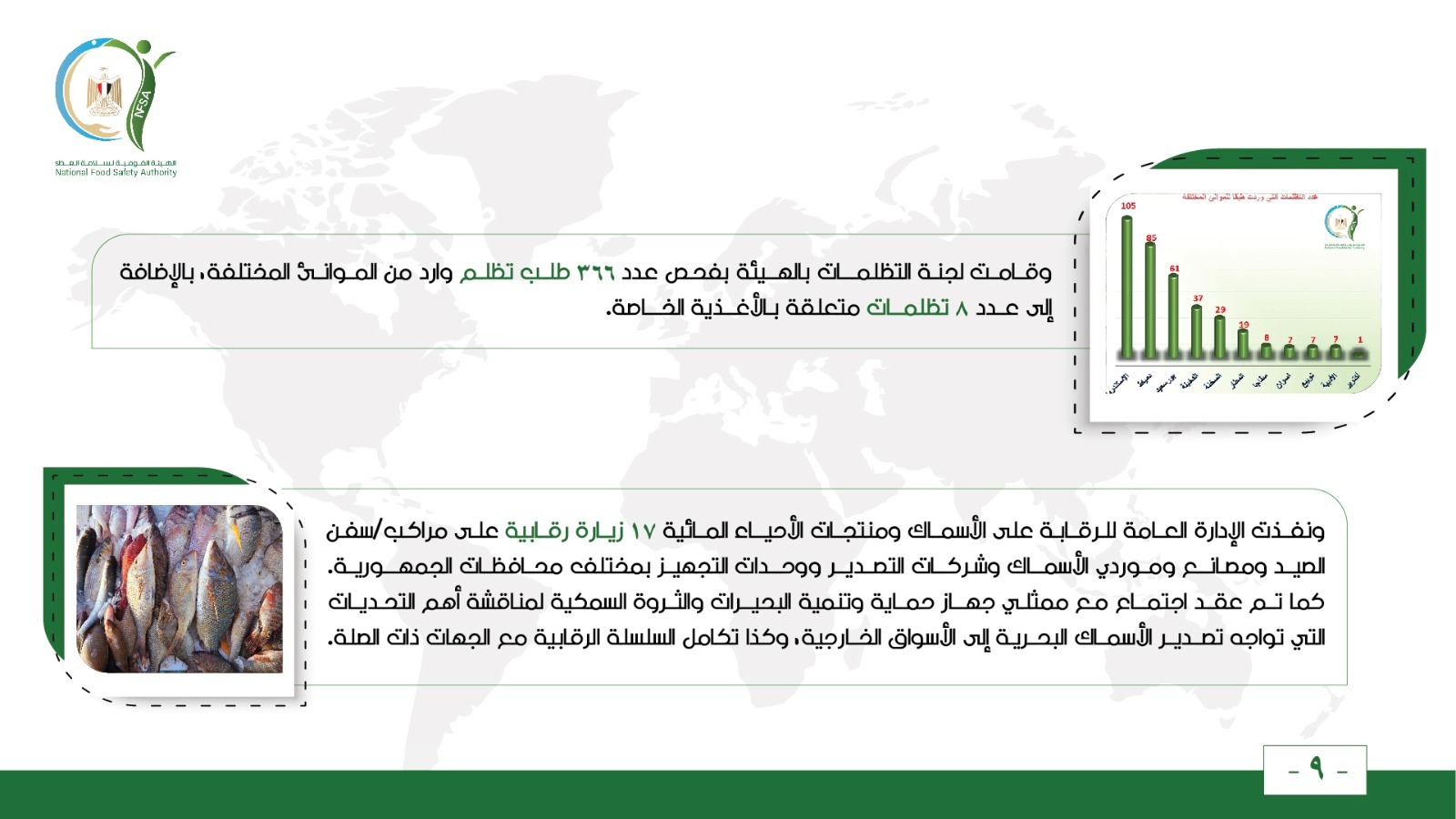 ونفذت الإدارة العامة للرقابة على الأسماك ومنتجات الأحياء المائية 17 زيارة رقابية على مراكب/سفن الصيد ومصانع وموردي الأسماك وشركات التصدير ووحدات التجهيز بمختلف محافظات الجمهورية.
