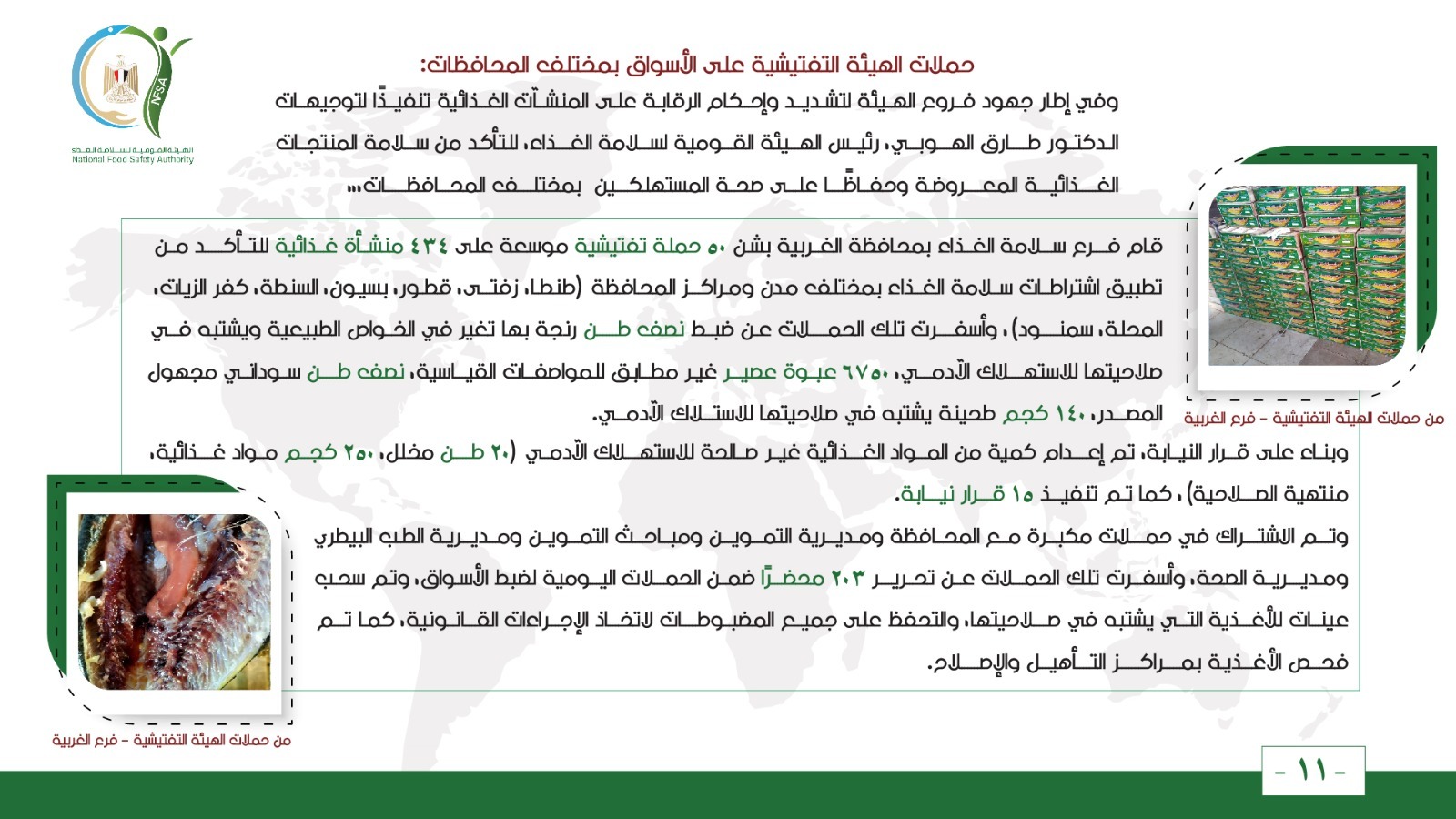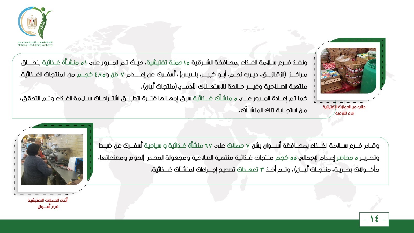 وقام فرع سلامة الغذاء بمدينة بدر بشن حملات مختلفة على عدد 62 منشأة غذائية أسفرت عن ضبط 500 كجم مواد غذائية متنوعة منتهية الصلاحية ومجهولة المصدر (عصائر، شوكولاتة، منتجات ألبان، مشروبات غازية)، وتم إعدام جميع تلك المنتجات في حضور لجنة من مفتشي هيئة سلامة الغذاء.