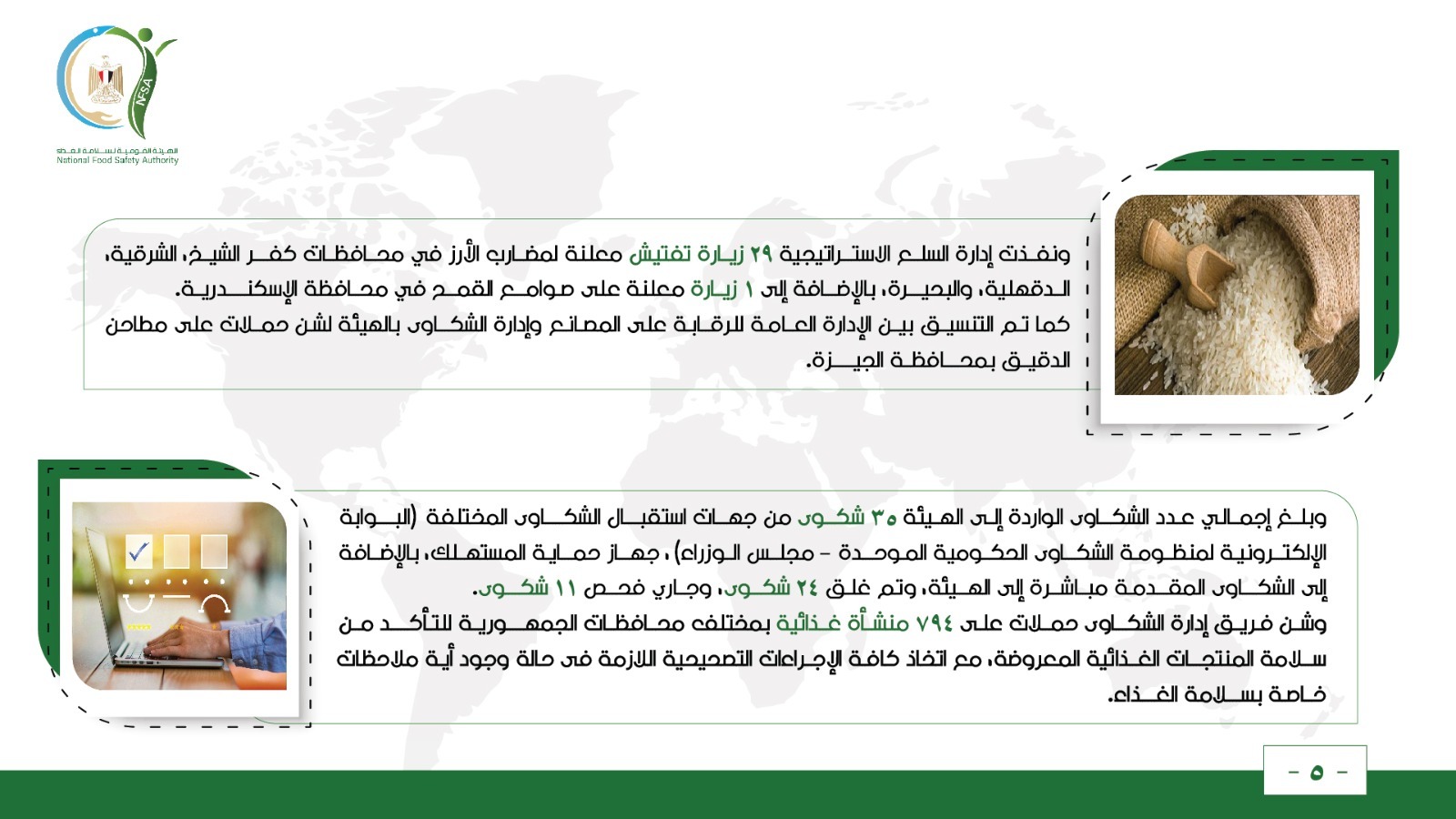 ونفذت إدارة السلع الاستراتيجية 29 زيارة تفتيش معلنة لمضارب الأرز في محافظات كفر الشيخ، الشرقية، الدقهلية، والبحيرة، بالإضافة إلى 1 زيارة معلنة على صوامع القمح في محافظة الإسكندرية.