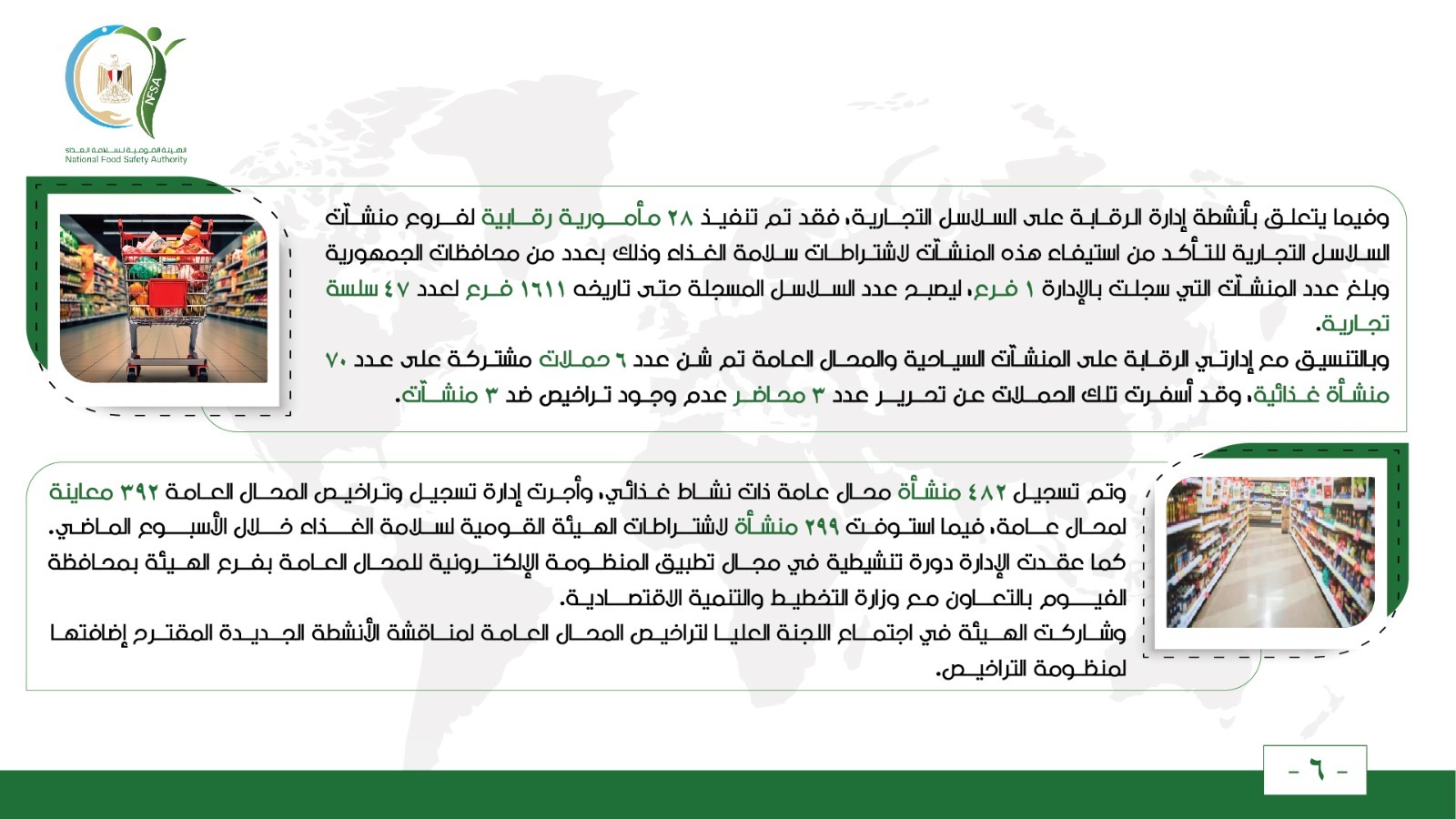 وفيما يتعلق بأنشطة إدارة الرقابة على السلاسل التجارية، فقد تم تنفيذ 28 مأمورية رقابية لفروع منشآت السلاسل التجارية للتأكد من استيفاء هذه المنشآت لاشتراطات سلامة الغذاء وذلك بعدد من محافظات الجمهورية، وبلغ عدد المنشآت التي سجلت بالإدارة 1 فرع، ليصبح عدد السلاسل المسجلة حتى تاريخه 1611 فرع لعدد 47 سلسة تجارية.
