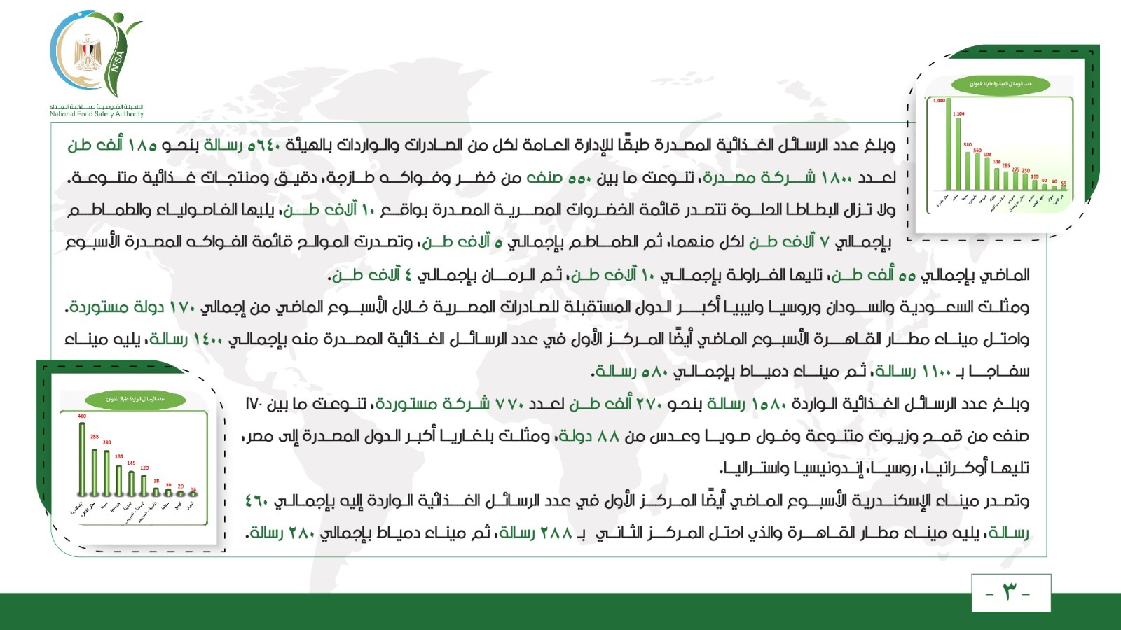 واحتل ميناء مطار القاهرة الأسبوع الماضي أيضًا المركز الأول في عدد الرسائل الغذائية المصدرة منه بإجمالي 1400 رسالة، يليه ميناء سفاجا بـ 1100 رسالة، ثم ميناء دمياط بإجمالي 580 رسالة.