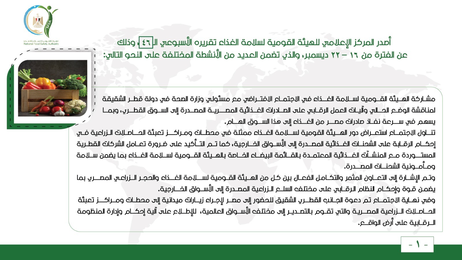 أصدر المركز الإعلامي للهيئة القومية لسلامة الغذاء تقريره الأسبوعي الـ 46، وذلك عن الفترة من 16 - 22 ديسمبر، والذي تضمن العديد من الأنشطة المختلفة على النحو التالي: