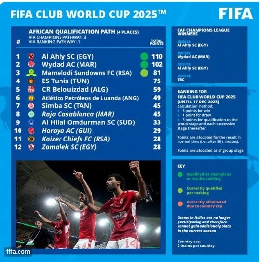 أعلن الاتحاد الدولي لكرة القدم "فيفا"، عن تصنيف الفرق الأفريقية، من أجل المشاركة في بطولة كأس العالم للأندية 2025.