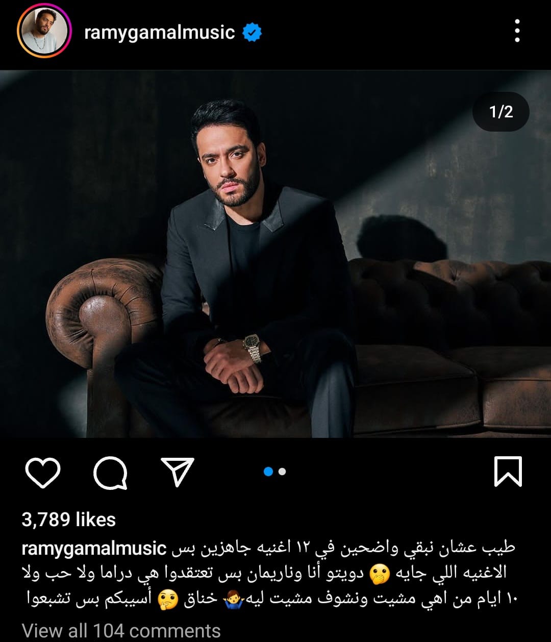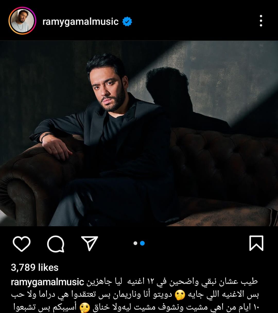 وشارك"جمال" جمهوره بعدة صورا له، وذلك عبر حسابه الخاص بموقع تبادل الصور والفيديوهات"انستجرام"، وكتب:طيب عشان نبقى واضحين في 12 أغنية جاهزين بس الأغنية الجاية دويتو أنا وناريمان بس تعتقدوا هي دراما ولا حب ولا 10 أيام من أهي مشيت ونشوف مشيت ليه خناق، اسيبكم بس تشبعوا".