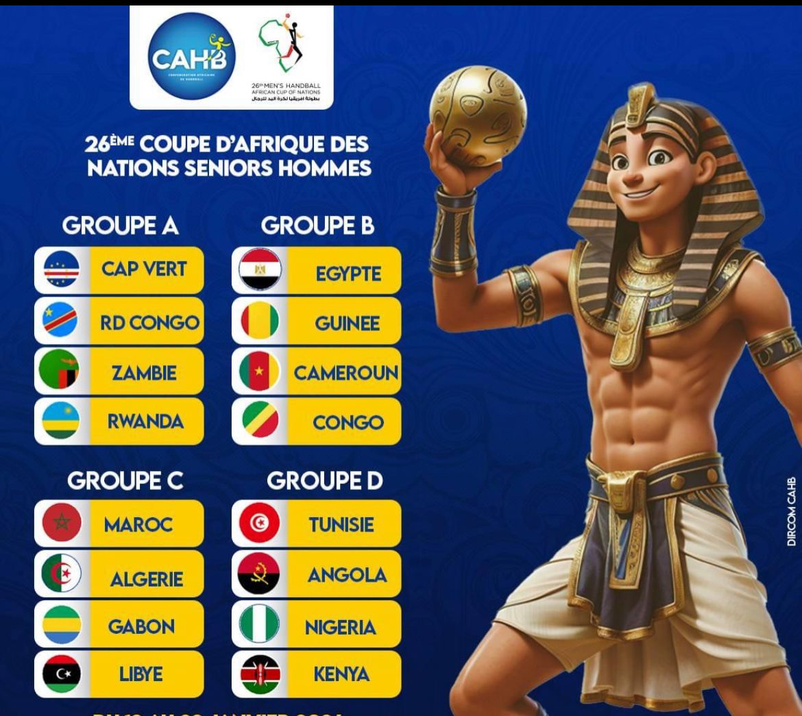 وأسفرت قرعة بطولة كأس الأمم الأفريقية لكرة اليد 2024 والتي تقام بمشاركة 16 منتخبًا بمشاركة منتخب مصر صاحب الأرض، عن وقوع المنتخب الوطني ضمن المجموعة الثانية التي ضم الكونغو – الكاميرون- غينيا.