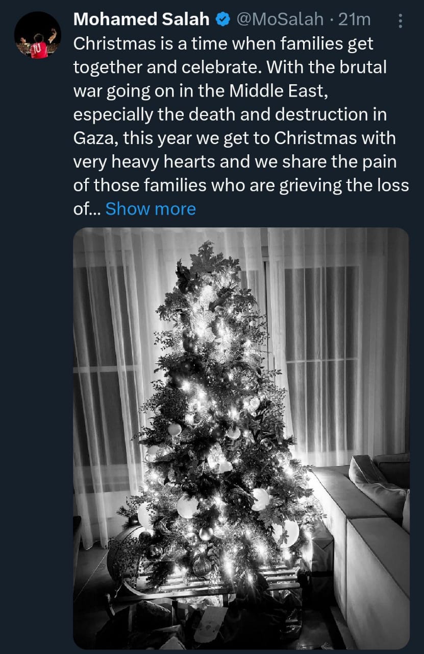 وكتب محمد صلاح عبر حسابه على موقع التواصل الإجتماعي "إكس": "عيد الميلاد هو الوقت الذي تجتمع فيه العائلات وتحتفل، مع استمرار الحرب الوحشية فى الشرق الأوسط، خاصة الموت والدمار فى غزة، نحتفل هذا العام بعيد الميلاد بقلوب مثقلة للغاية".