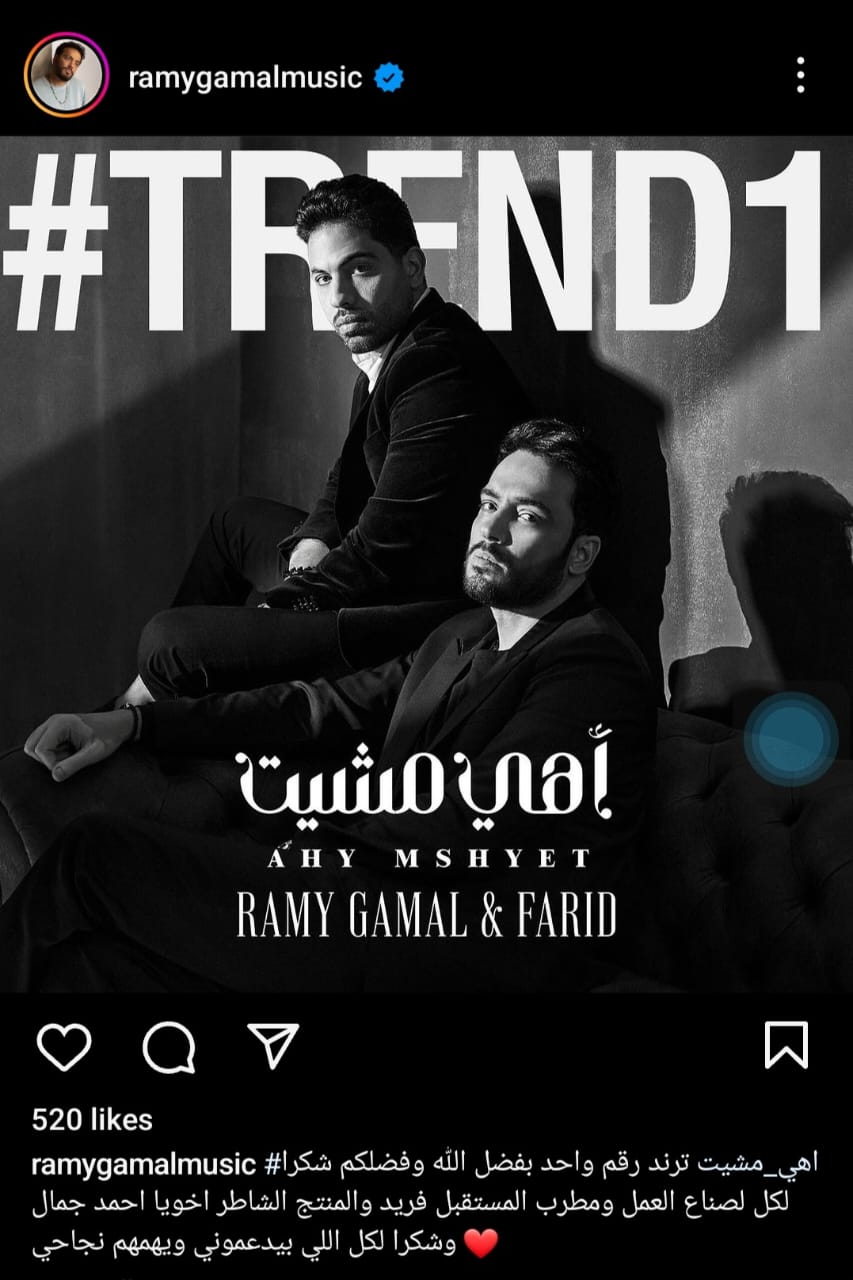 احتفل المطرب رامي جمال بتصدر أغنيته الجديدة "أهي مشيت" مع المطرب فريد التريند رقم"1" بعد مرور 24 ساعة من طرحها على اليوتيوب.