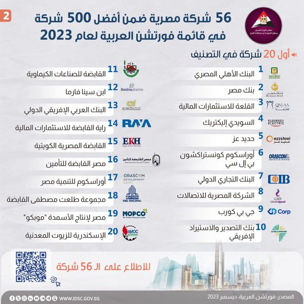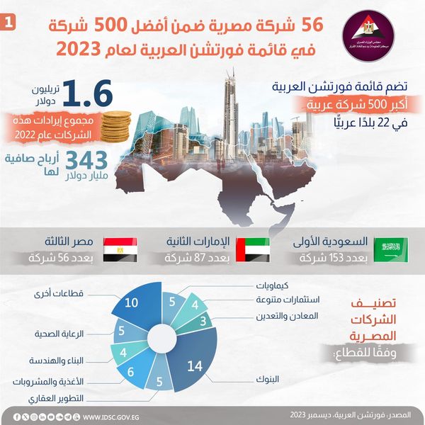 كشف مركز معلومات مجلس الوزراء أن هناك 56 شركة مصرية ضمن أفضل 500 شركة في قائمة فورتشن العربية لعام 2023، في 22 بلدًا عربيًّا، مسجلة 1.6 تريليون دولار مجموع إيراداتها عام 2022.