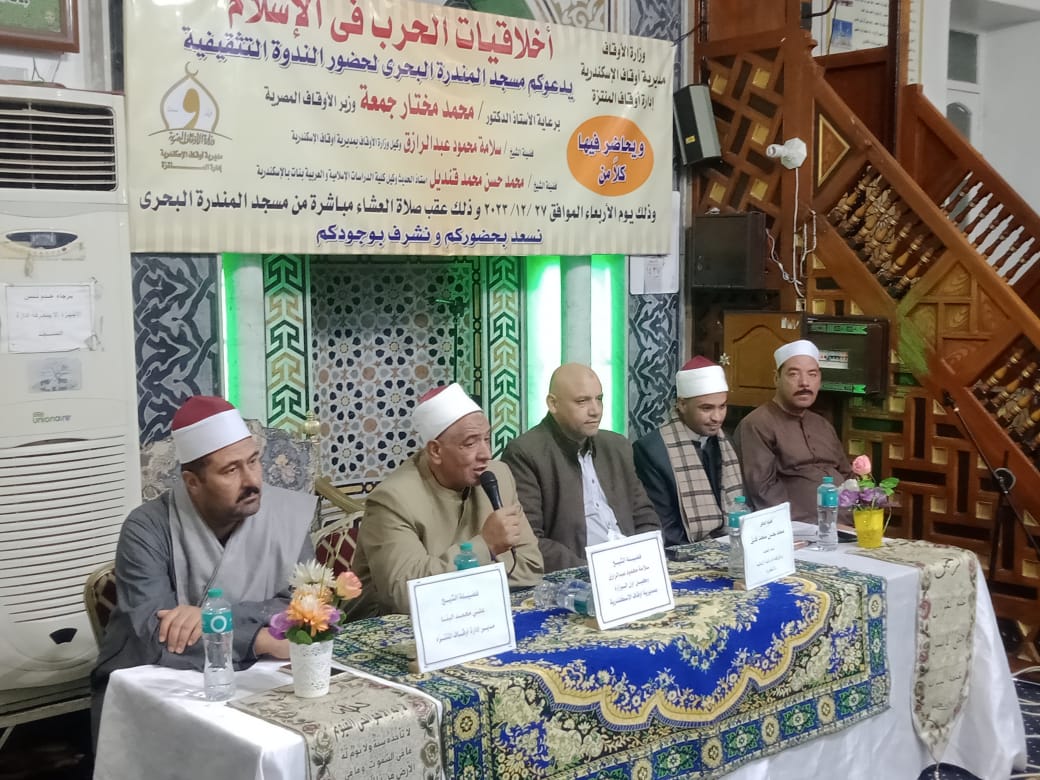 برعاية الدكتورمحمد مختار جمعة ، وزير الأوقاف نظمت مديرية أوقاف الإسكندرية ندوة تثقيفية تحت عنوان (أخلاقيات الحرب في الإسلام) بمسجد المندرة البحري بإدارة أوقاف المنتزة بحضور الشيخ سلامة عبدالرازق- وكيل وزارة الأوقاف بالأسكندرية، وفضيلة الدكتورمحمد حسن محمد قنديل- أستاذ ورئيس قسم الحديث بكلية الدراسات الإسلامية والعربية بنات الإسكندرية، وفضيلة الشيخ وسام كاسب- مدير المتابعة، وفضيلة الشيخ على البنا- مدير إدارة المنتزة، وفضيلة الشيخ رأفت عبد العزيز-إمام وخطيب المسجد، وفضيلة القارئ الشيخ محمد البهلون.