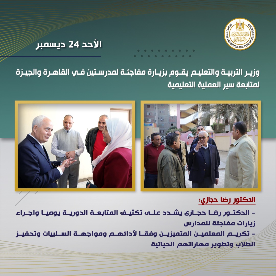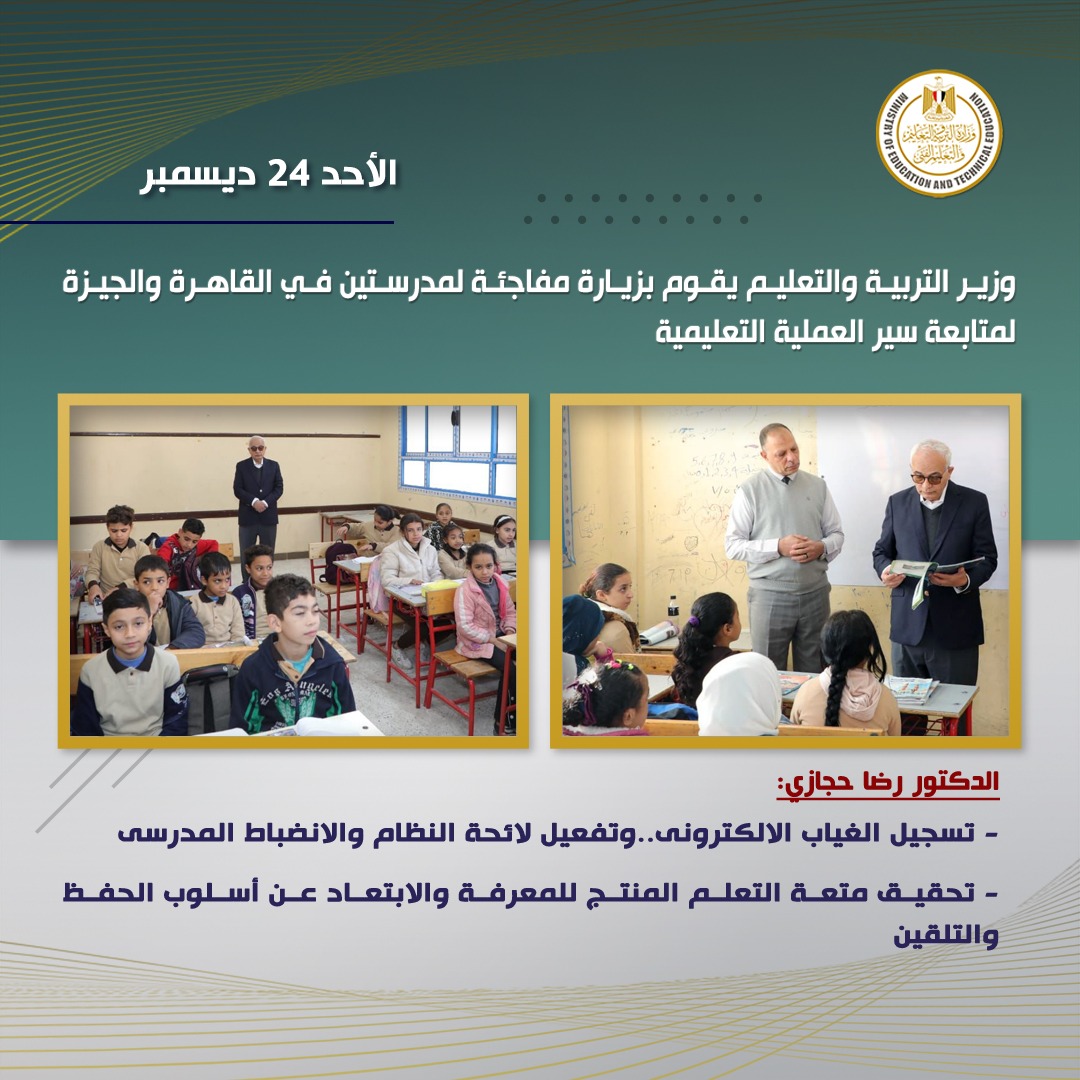 وأكد الدكتور رضا حجازي أنه سيقوم بجولات مفاجئة ومكثفة لمختلف المدارس على مستوى الجمهورية لمتابعة انتظام سير العملية التعليمية.