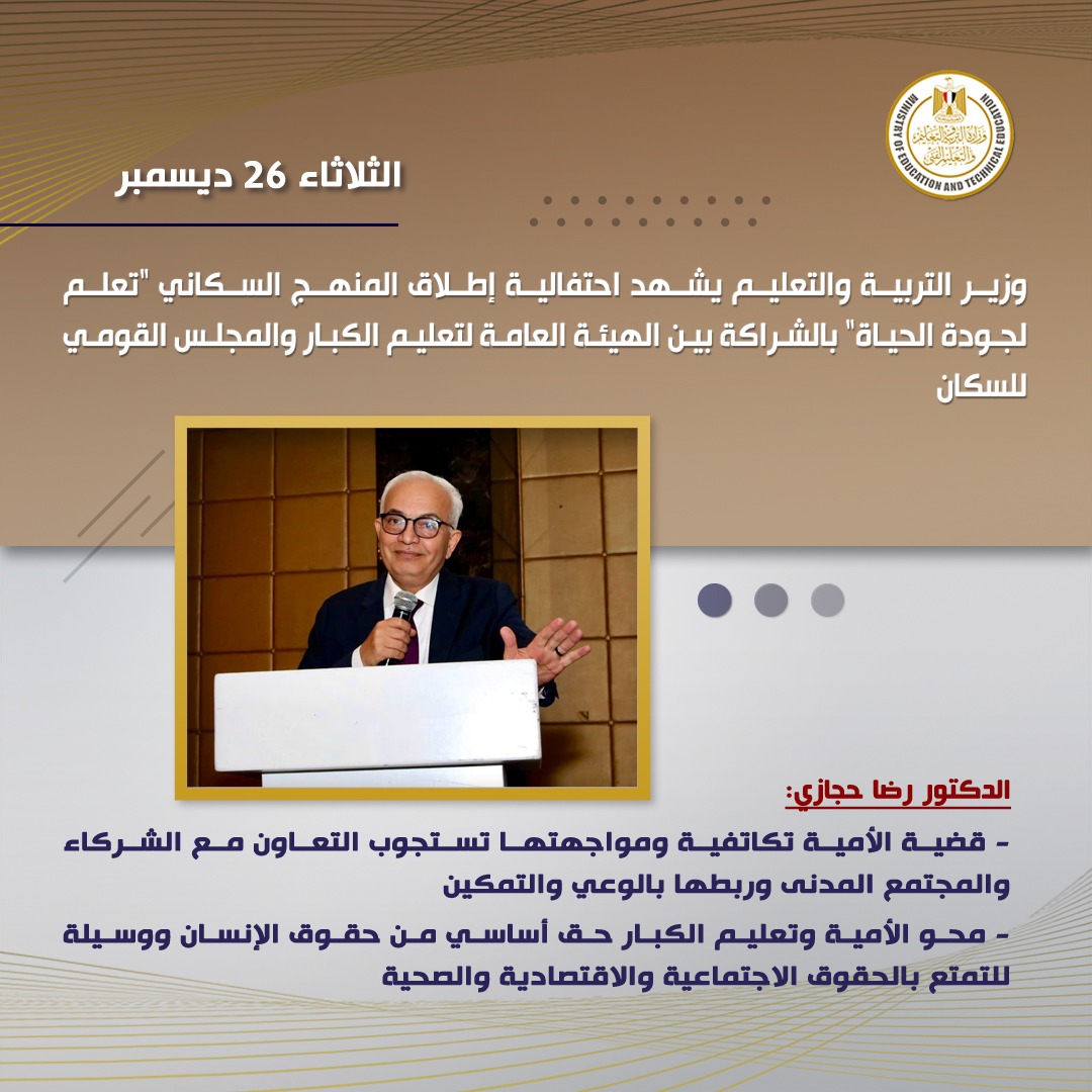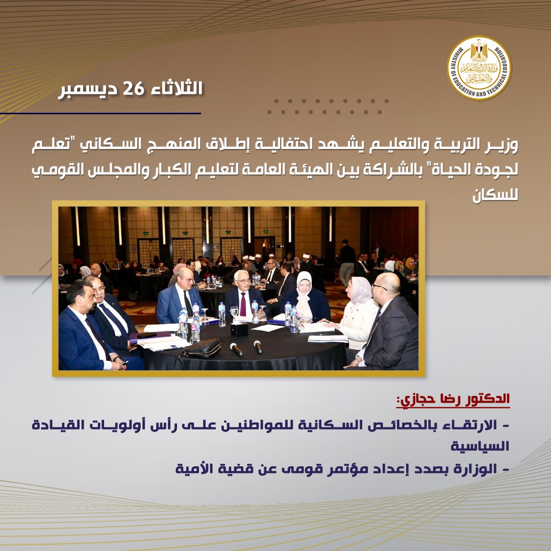 شهد الدكتور رضا حجازى وزير التربية والتعليم والتعليم الفنى، احتفالية إطلاق المنهج السكاني، الذي يتم بالشراكة بين الهيئة العامة لتعليم الكبار، والمجلس القومي للسكان، والتي نتج عنها إعداد منهج متخصص للدارسين الكبار، عنوانه "تعلم لجودة الحياة"، ويتناول القضايا السكانية المختلفة، ويربطها بقضية الأمية، في إطار تعليمي توعوي تثقيفي.