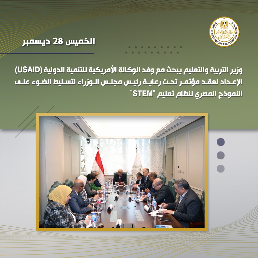 ومن جانبه، أكد وفد الوكالة الأمريكية للتنمية الدولية (USAID) الحرص على تعزيز التعاون مع وزارة التربية والتعليم والتعليم الفني للاستثمار في الطلاب المصريين وتنميتهم، وكذلك الارتقاء بالتنمية المهنية للمعلمين، لتحقيق استراتيجية الوزارة في تطوير التعليم.