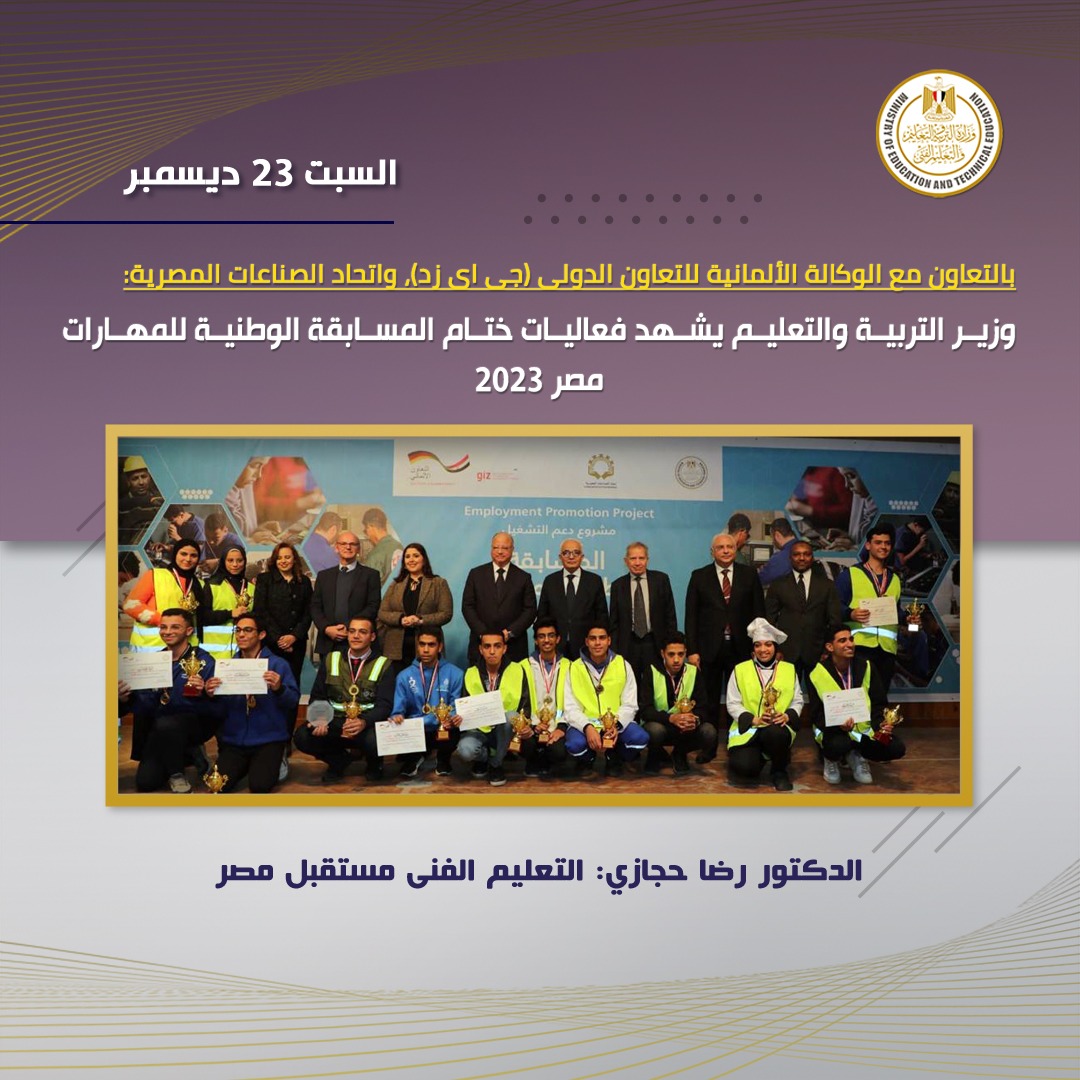 شهد الدكتور رضا حجازي وزير التربية والتعليم والتعليم الفني فعاليات ختام فعاليات المسابقة الوطنية للمهارات مصر 2023 بالتعاون مع الوكالة الألمانية للتعاون الدولى (جى اى زد)، واتحاد الصناعات المصرية.