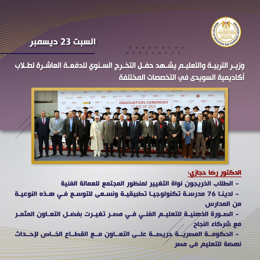 شهد الدكتور رضا حجازى وزير التربية والتعليم والتعليم الفنى، احتفالية تخرج الدفعة العاشرة من طلاب أكاديمية السويدى، والتي يبلغ عدد طلابها 350 طالب وطالبة، وأقيمت بمقر مؤسسة السويدي إلكتريك بالتجمع الخامس.