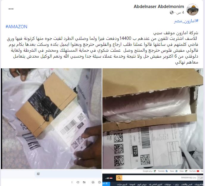 وقال صاحب المشكلة عبر السوشيال ميديا ،" شركة امازون موقف سيي ..للاسف اشتريت تلفون من عندهم ب 14400ودفعت فيزا ولما وصلني الطرد لقيت جوه منها كرتونة فيها ورق فاضي كلمتهم في ساعتها قالوا عملنا طلب ارجاع والفلوس حترجع وبعتوا ايميل بكده وسكت".