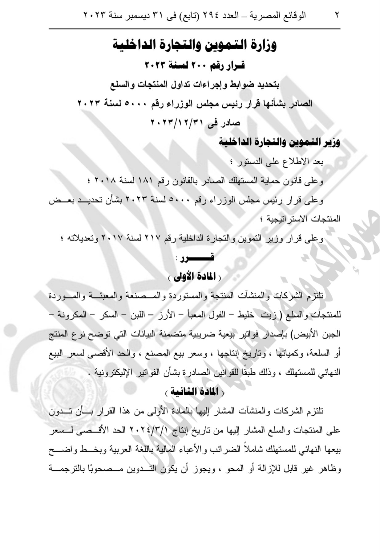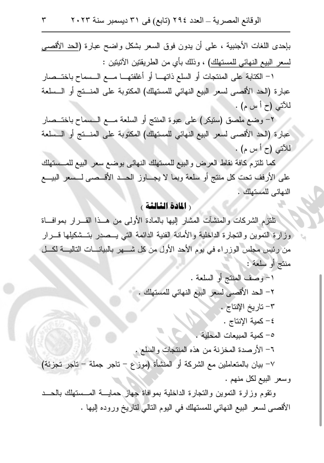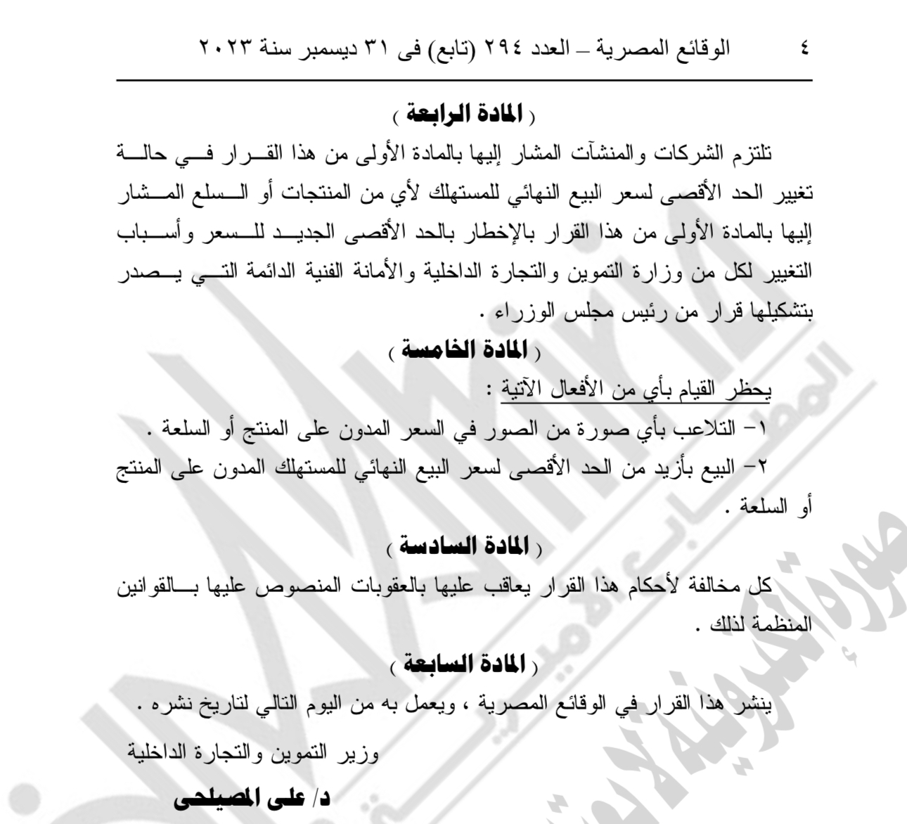 كما تضمن القرار إلزام الشركات بأن تدون على المنتجات من تاريخ إنتاج 1 مارس 2024 الحد الأقصى لسعر بيعها النهائى للمستهلك شاملًا الضرائب والأعباء المالية وبخط واضح، ووضع ملصق " ستيكر" على عبوة المنتج ويدون فوق السعر عبارة " الحد الأقصى لسعر البيع النهائى للمستهلك"