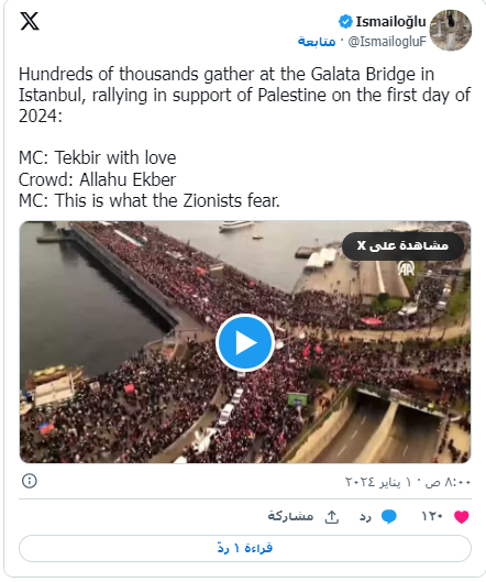 بدورها، رددت مجموعة تحمل لافتات مكتوبة باللغات التركية والعربية والإنجليزية التكبيرات بشكل متكرر.