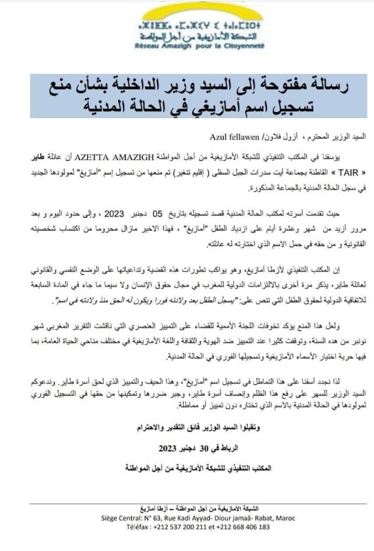وعبرت تلك المنظمة الحقوقية في رسالتها عن أسفها “لمنع عائلة طاير (TAIR)، القاطنة بتراب جماعة، آيت سدرات الجبل السفلى، (في إقليم تنغير)، من تسجيل اسم (أمازيغ) لمولودها الجديد في سجل الحالة المدنية بالجماعة المذكورة”.