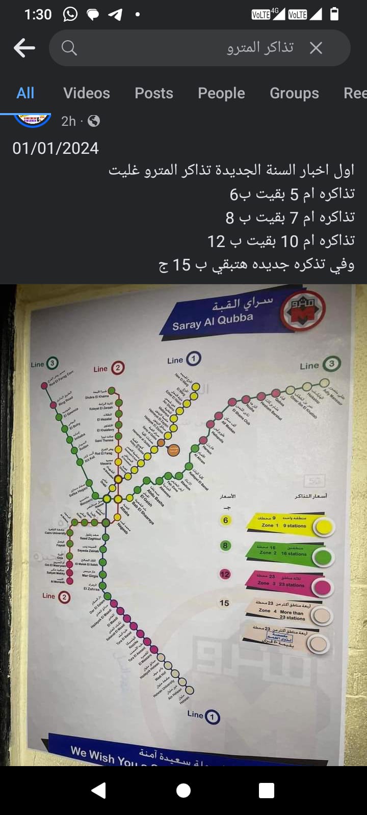اسعار تذاكر المترو..قيمة تذكرة الأكثرمن 23 محطة (أربع مناطق) تصبح بـ 15 جنيهاً