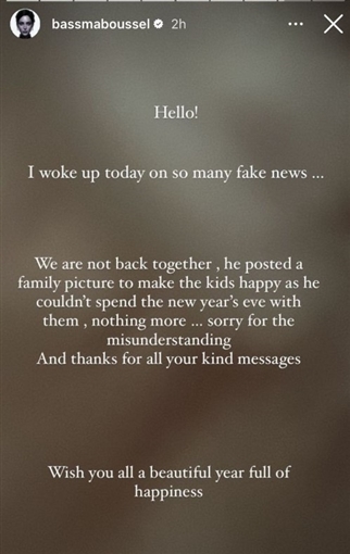 وأضافت "لم نعد معا، هو قام بنشر صورة عائلية من أجل إسعاد الأطفال لأنه لم يستطع قضاء ليلة رأس السنة معهم ليس إلا، اسفة على سوء الفهم وشكرا على كل الرسائل اللطيفة واتمنى لكم جميعا سنة سعيدة".