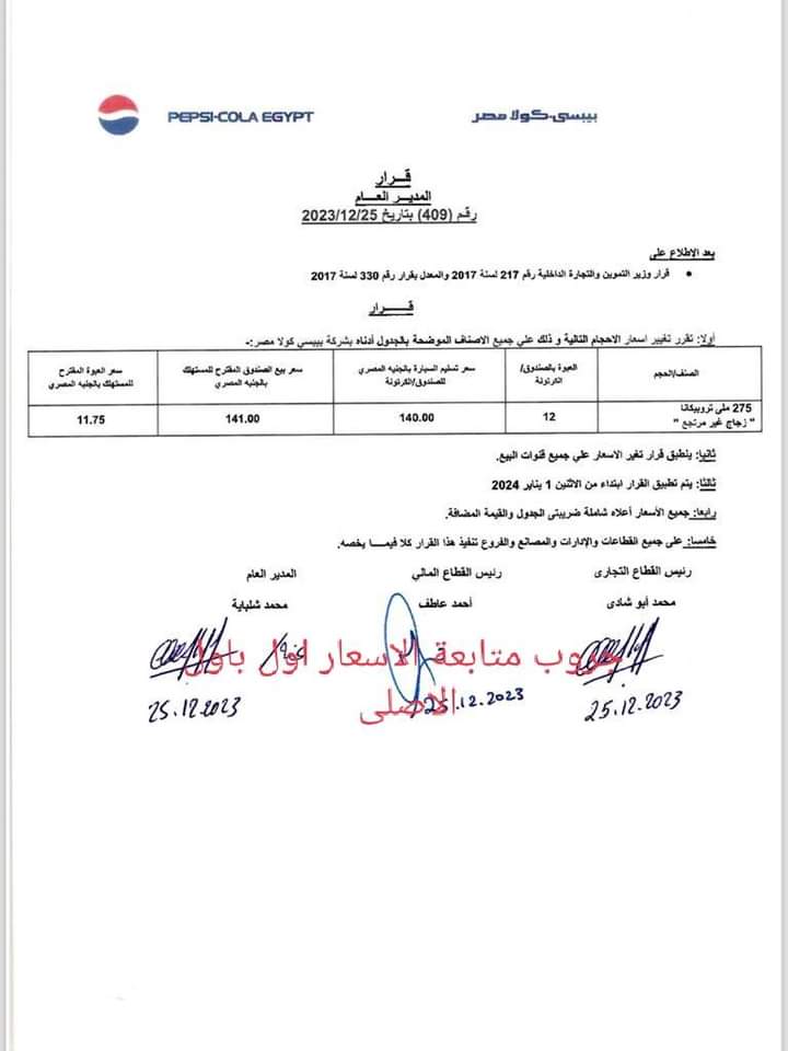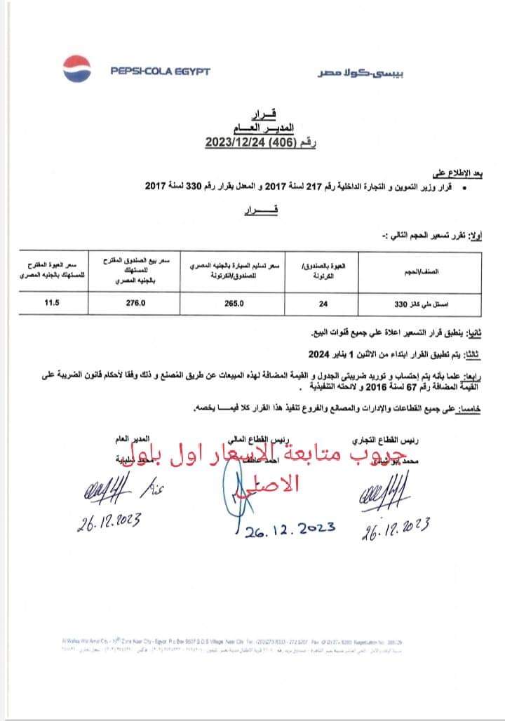 أعلنت شركة بيبسيكو مصر عن زيادة أسعار منتجاتها في داخل مصر علي هذه الانواع :