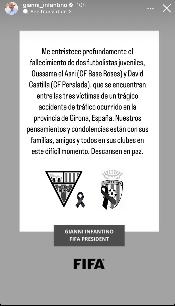 نعى رئيس الأتحاد الدولي لكرة القدم الفيفا جياني إنفانتينو عبر حسابه الرسمي على منصة إنستجرام اللاعبين المغربي " أسامة العصري " من فريق (CF Base Roses) و ديفيد كاستيلا.