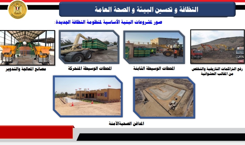 استعرض اللواء هشام آمنة وزير التنمية المحلية، إنجازات وزارة التنمية المحلية في مجال تحسين البيئة وبرنامج النظافة خلال عام 2023 ، مشيرًا الي أنه تم صرف مبلغ 8 مليار جنيه على تحسين البيئة وبرنامج النظافة حيث تم رفع تراكمات تاريخية قدرها (1.5) مليون طن كما تم رفع متولد يومي قدره ( 23) مليون طن كما تم تنفيذ مشروعات بنية أساسية وتسليم عدد ( 1 ) محطة وسيطة ثابتة وتسليم عدد 3 مصانع مخلفات وتسليم عــدد 10 مدافن صحية خلال العام الماضي ، لافتاً أنه من المخطط صرف مبلغ 9 مليار جنيه خلال العام المالي 2023 – 2024 لرفع تراكمات تاريخية قدرها (2) مليون طن، ورفع متولد يومى قدره( 23.5) مليون طن واستكمال تنفيذ ( 5 ) محطة وسيطة ثابتة و(18) مدفن صحى .