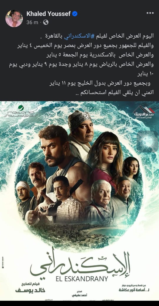 روج المخرج خالد يوسف لفيلمه الجديد "الإسكندراني" بطولة النجم أحمد العوضي، والذي من المقرر طرحه 4 يناير بجميع دور العرض.