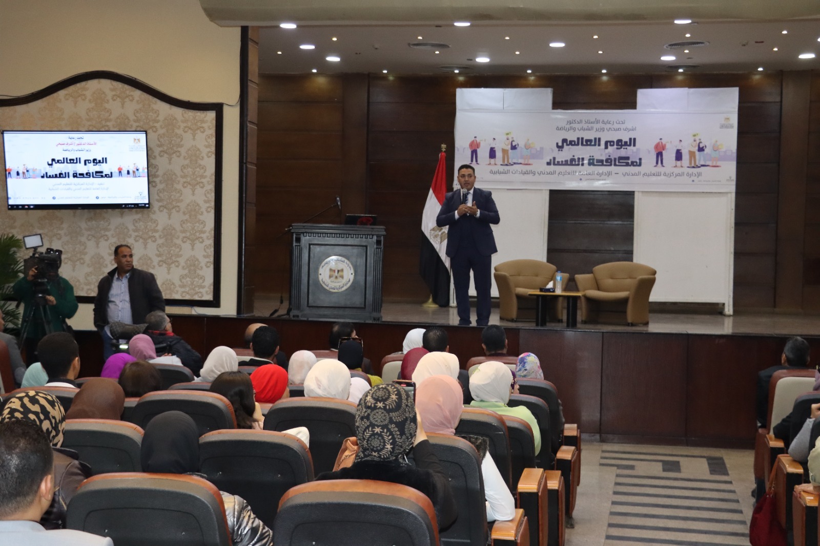 نظمت وزارة الشباب والرياضة، من خلال الإدارة المركزية للتعليم المدني، بالتعاون مع الأكاديمية الوطنية لمكافحة الفساد، وحدة السياسات بالوزارة، احتفالية بمناسبة اليوم العالمي لمكافحة الفساد والذي يصادف الـ 9 من ديسمبر من كل عام، بمشاركة 200 شابًا وشابة من الكيانات الشبابية وأعضاء مراكز الشباب بــ 4محافظات هي "الجيزة، القاهرة، بني سويف، القليوبية"، بمركز التعليم المدني بالجزيرة.
