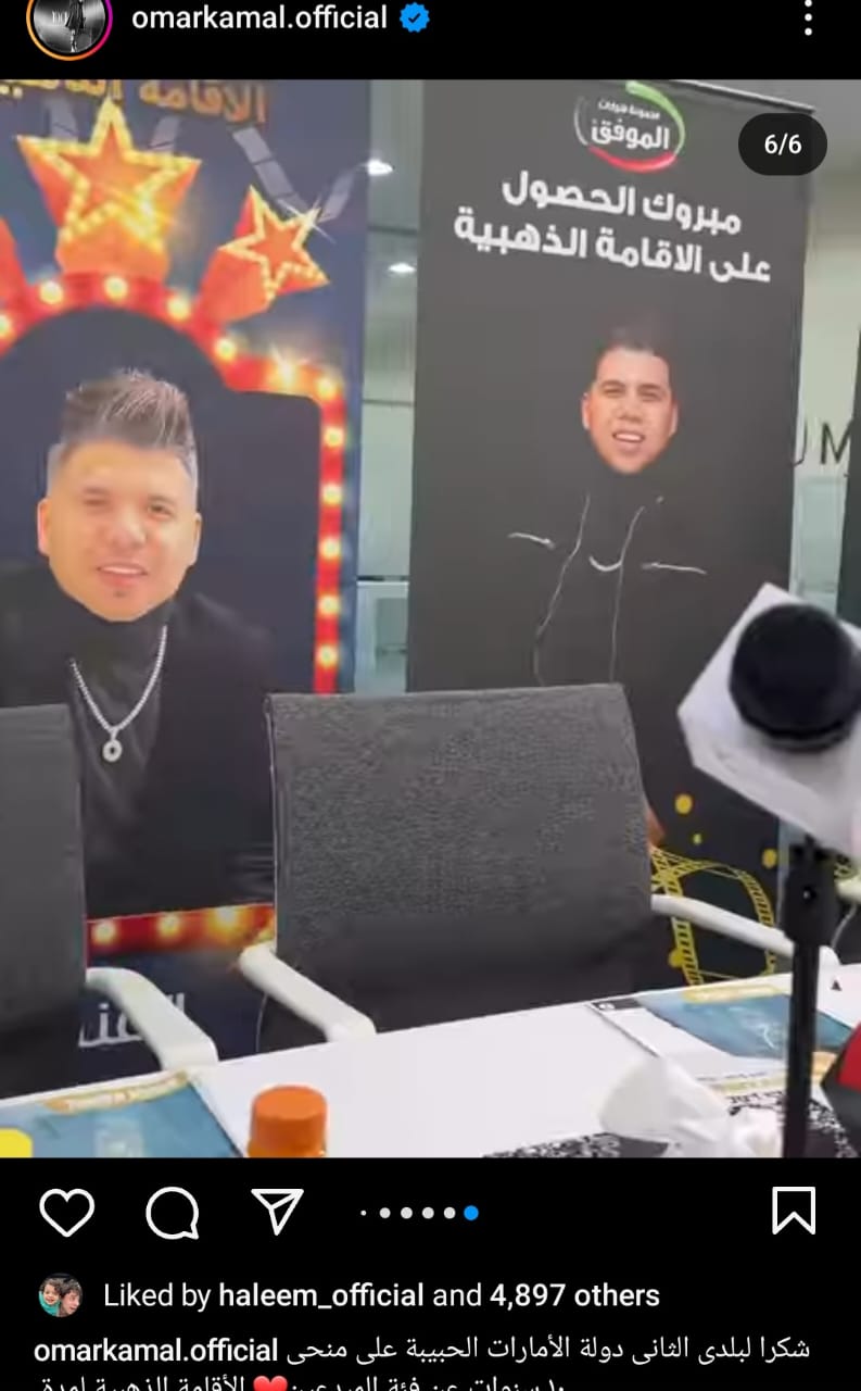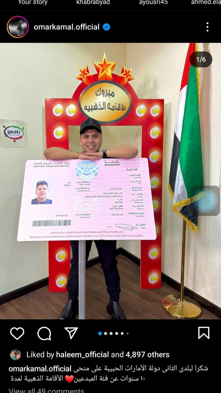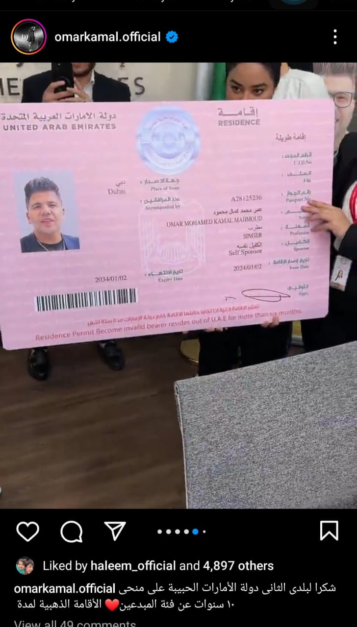 عمر كمال يحتفل بحصوله على الإقامة الذهبية لفئة المبدعين من الإمارات