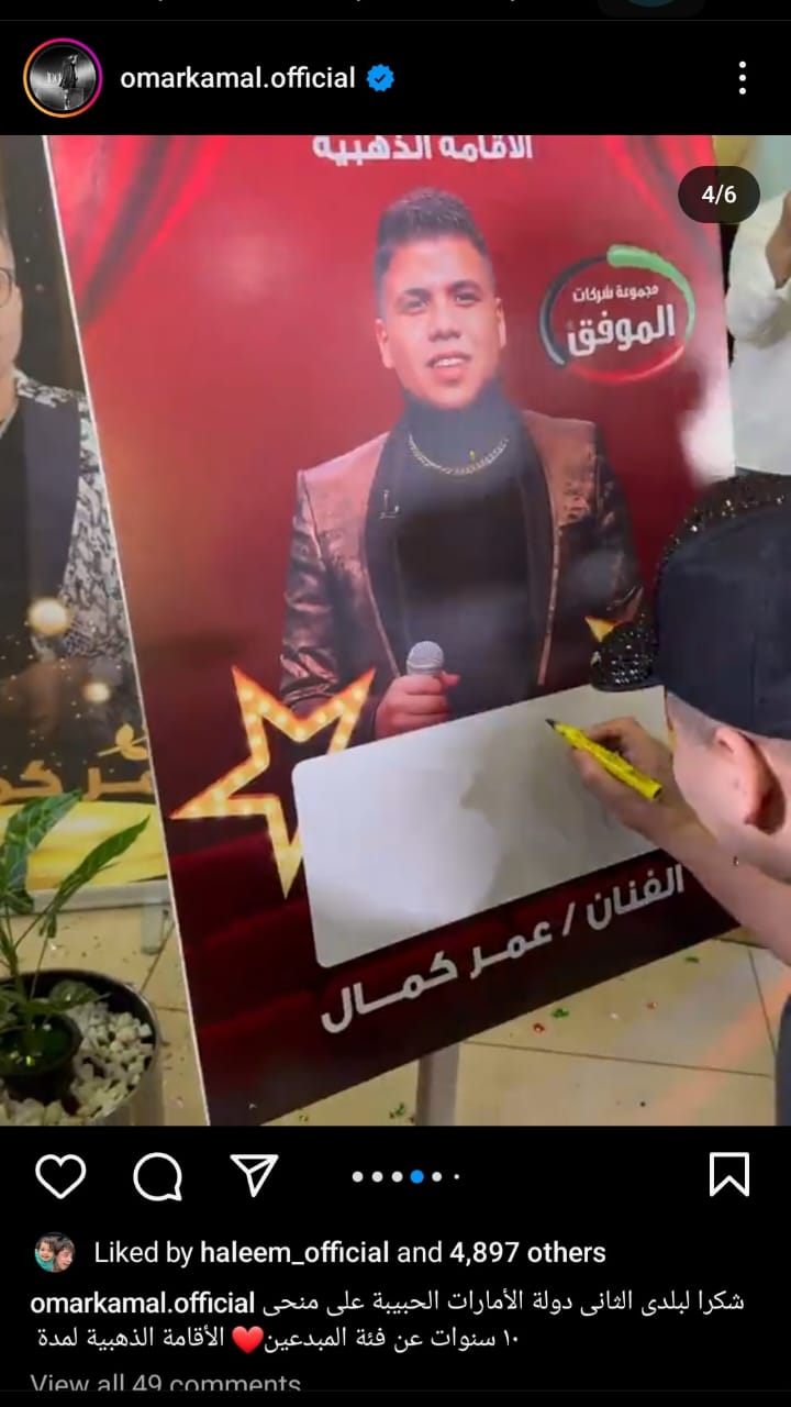 وشارك"كمال"جمهوره بعدة صورا له، وهو يتسلم الجائزة، وذلك عبر حسابه الخاص بموقع تبادل الصور والفيديوهات"انستجرام"، وكتب:"شكرا لبلدي الثاني دولة الإمارات على منحى الإقامة الذهبية لمدة 10 سنوات عن فئة المبدعين".