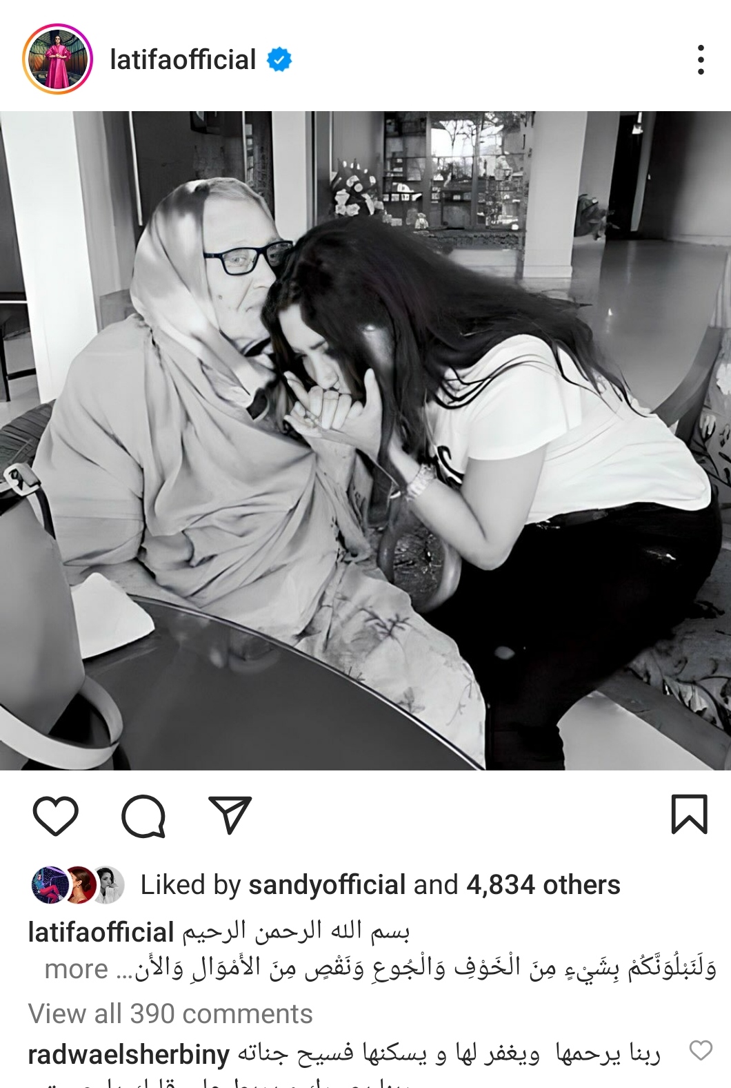 وكتبت لطيفة عبر صفحتها على موقع تبادل الصور والفيديوهات "إنستجرام": "الله يرحمك يا نور العين الله يرحمك يا غالية وجيعة كبيرة ماكنتش نتحملها لولا محبتكم والناس اللي واساوني وخلاوني نقوي علي تحمل الصدمه ومرارة الوجيعة .شكراااا من اعماق قلبي للناس اللي كلمتني وخففت عليا وحست بيا في الفترة الصعيبة هاذي".
