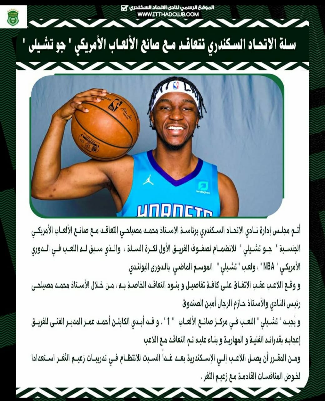 تعاقد نادي الإتحاد السكندري برئاسة محمد مصليحي، رئيس مجلس إدارة النادي مع اللاعب الأمريكي " جو تشيلي" من أجل تدعيم صفوف فريق كرة السلة بالنادي في الفترة القادمة.