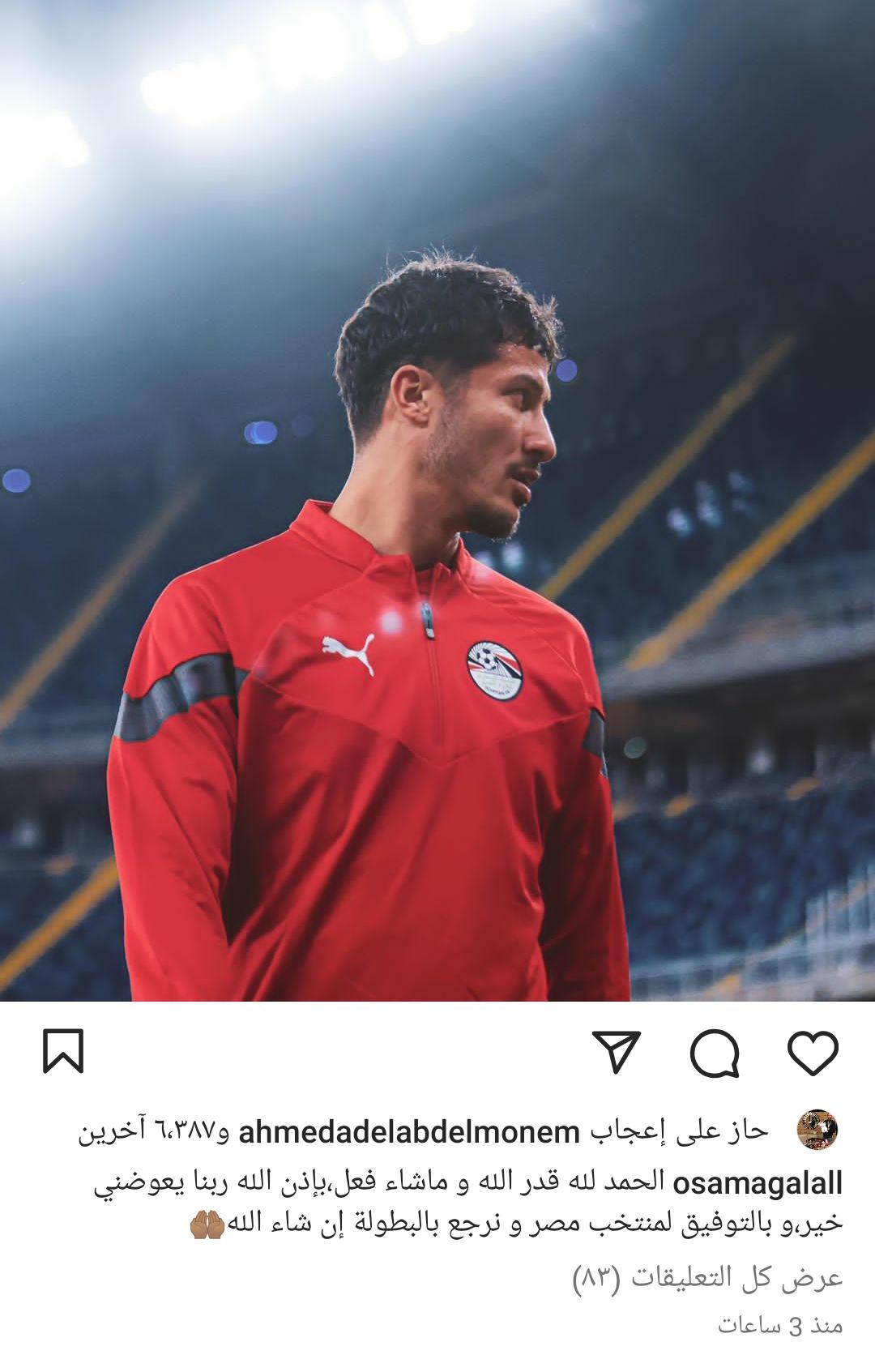 وقال أسامة جلال عبر صفحته على موقع التواصل الاجتماعى “انستجرام” ، " الحمد لله قدر الله وماشاء فعل بإذن الله ربنا يعوضني خير وبالتوفيق لمنتخب مصر ونرجع بالبطولة"