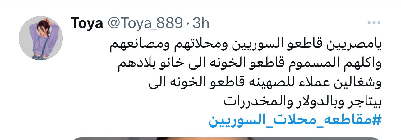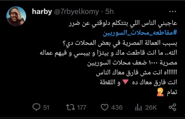 وهاجم المغرد "حربي"، المتعاطفيين مع المحلات السورية قائلاً: "عاجبني الناس اللي بتتكلم دلوقتي عن ضرر مقاطعة محلات السوريين، بسبب العمالة المصرية في بعض المحلات دي؟.. الله ما انت قاطعت ماك وبيتزا وبيبسي وفيهم عمالة مصرية 1000 ضعف محلات السوريين".