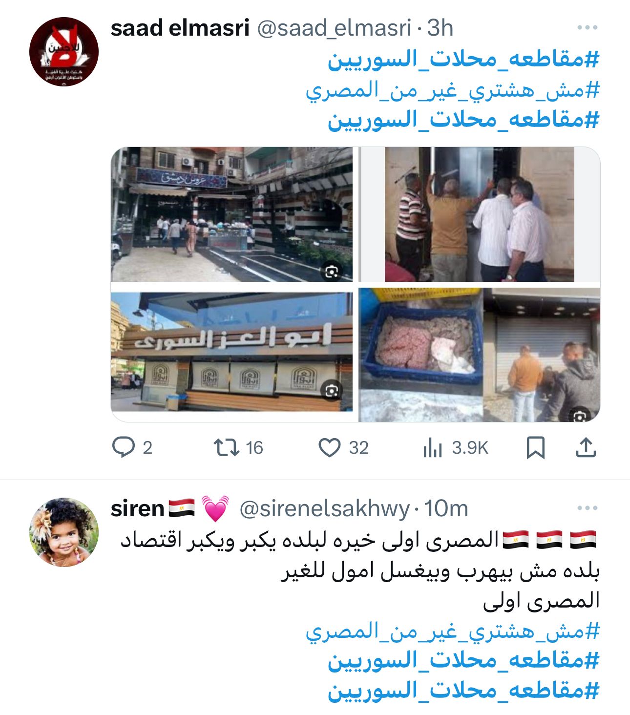 تصدر هاشتاج “قاطعوا محلات السوريين فى مصر” تريند منصة “إكس” وتداول عدد من رواد مواقع التواصل الاجتماعي، هاشتاجات مثيرة للجدل تحت عنوان "مقاطعة محلات السوريين" على منصة "إكس"، تويتر سابقاً، مطالبين فيها بإغلاق ومقاطعة المحلات السورية، وسط اتهامات لأصحاب المطاعم والمحلات بتزايد الأسعار، على خلفية ارتفاع أسعار السلع الغذائية وغيرها، في ظل الأزمة الاقتصادية التي تمر بها البلاد، على حد قول متداولى الهاشتاجات.