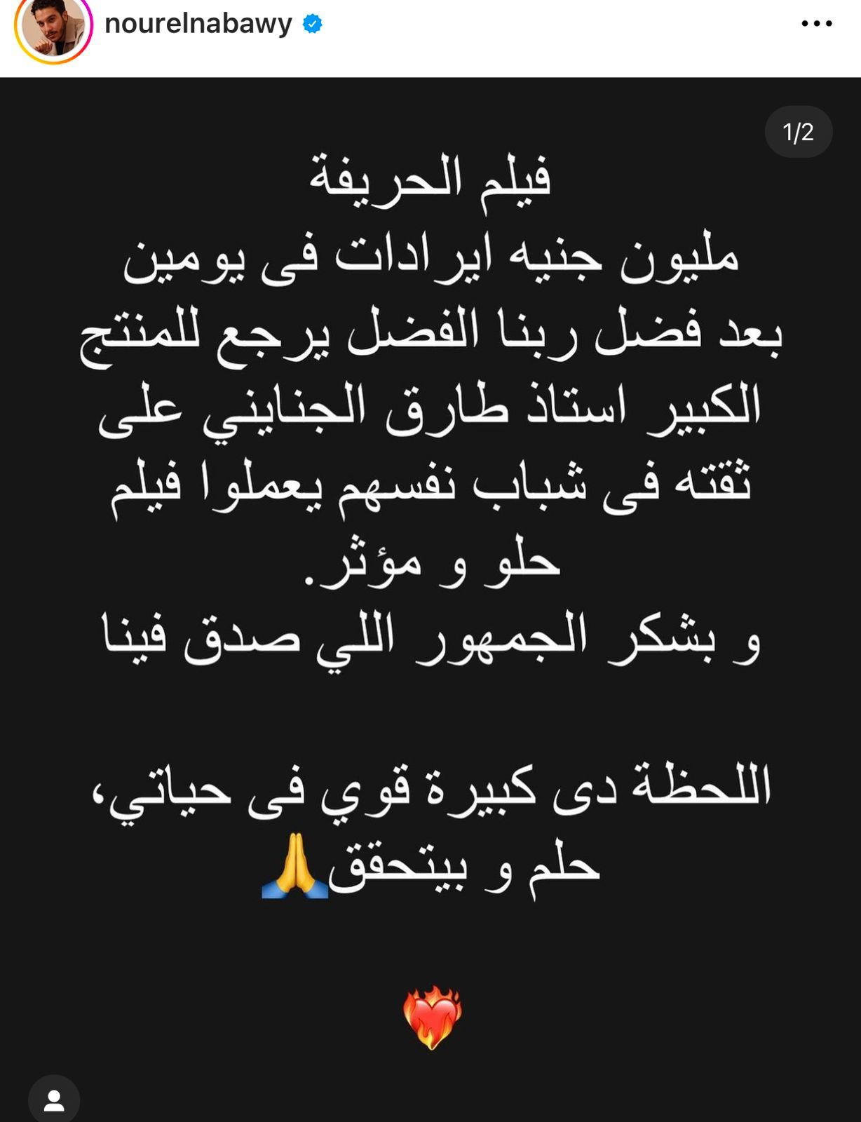 وكتب نور النبوي، على صفحته على موقع تبادل الصور والفيديوهات "إنستجرام": "فيلم الحريفة مليون جنيه ايرادات في يومين بعد فضل ربنا الفضل يرجع للمنتج الكبير استاذ طارق الجنايني على ثقته في شباب نفسهم يعملوا فيلم حلو و موثر و بشكر الجمهور اللي صدق فينا اللحظة دي كبيرة قوي في حياتى حلم و بيتحقق".