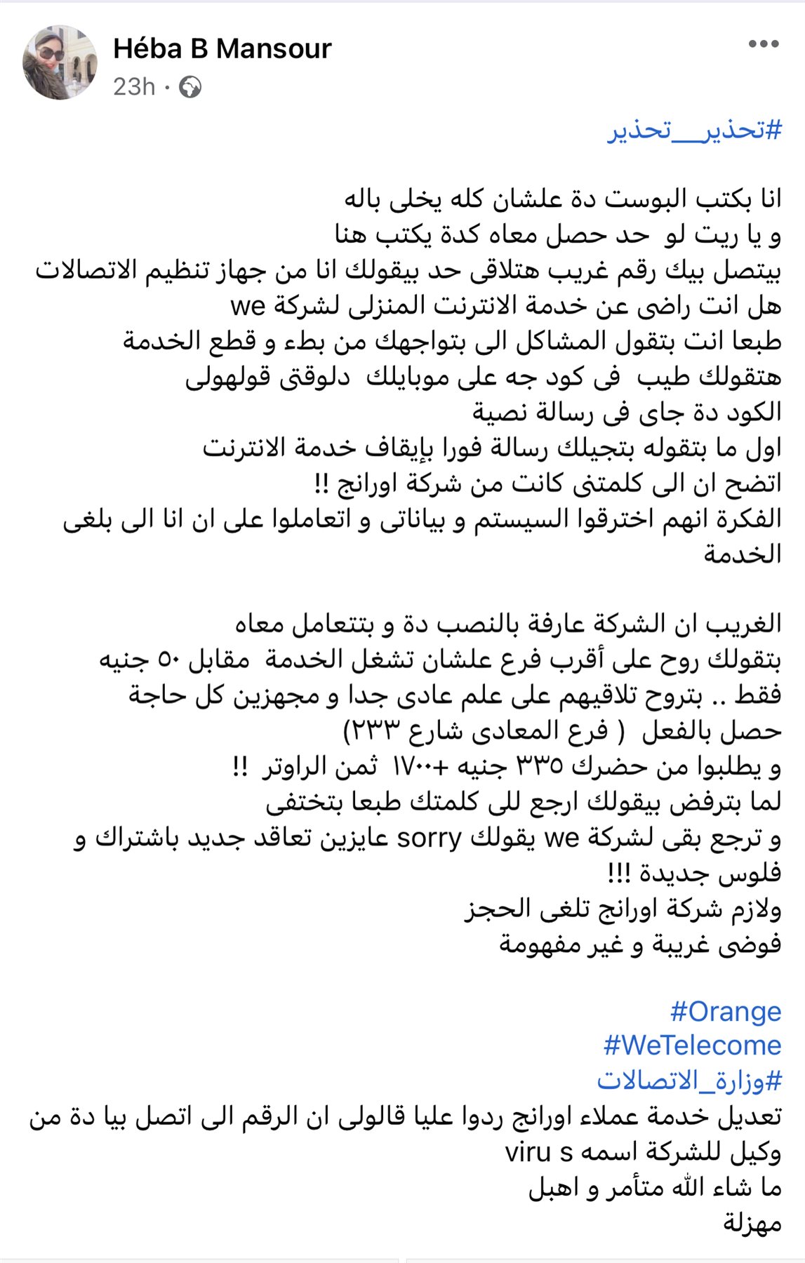 وتابعت فى عرض مشكلتها على السوشيال ميديا،" اول ما بتقوله بتجيلك رسالة فورا بإيقاف خدمة الانترنت اتضح ان الى كلمتنى كانت من شركة اورانج !!الفكرة انهم اخترقوا السيستم و بياناتى و اتعاملوا على ان انا الى بلغى الخدمة الغريب ان الشركة عارفة بالنصب دة و بتتعامل معاه بتقولك روح على أقرب فرع علشان تشغل الخدمة مقابل 50 جنيه فقط .. بتروح تلاقيهم على علم عادى جدا و مجهزين كل حاجة حصل بالفعل ( فرع المعادى شارع 233) و يطلبوا من حضرك 335 جنيه +1700 ثمن الراوتر !! لما بترفض بيقولك ارجع للى كلمتك طبعا بتختفى