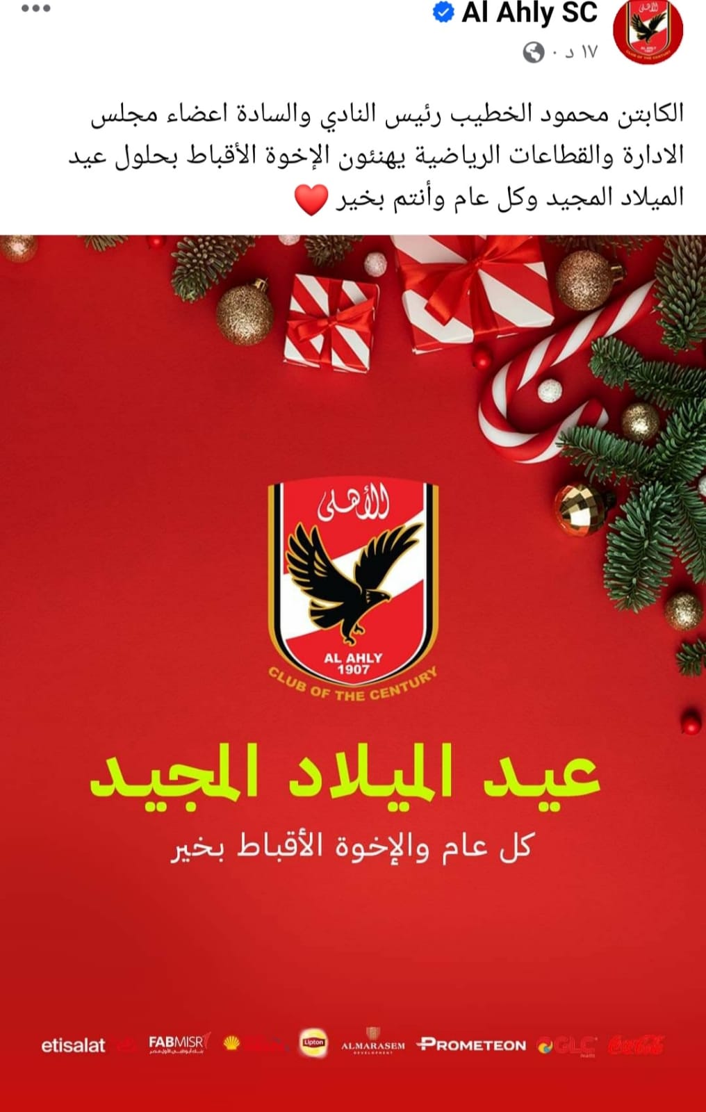 وقال النادي الأهلي في منشور: "الكابتن محمود الخطيب رئيس النادي والسادة اعضاء مجلس الادارة والقطاعات الرياضية يهنئون الإخوة الأقباط بحلول عيد الميلاد المجيد وكل عام وأنتم بخير".