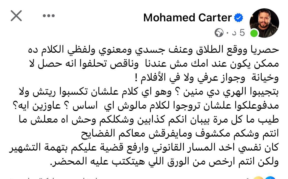 وكتب "كارتر" عبر حسابه بموقع فيس بوك: "حصريا ووقع الطلاق وعنف جسدي ومعنوي ولفظي الكلام ده ممكن يكون عند امك مش عندنا وناقص تحلفوا انه حصل لا وخيانة وجواز عرفي ولا في الأفلام !".