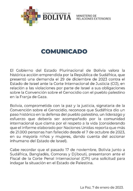 أعلنت وزارة الخارجية البوليفية تأييدها للدعوى التي رفعتها جنوب إفريقيا أمام محكمة العدل الدولية ضد إسرائيل على جرائم الإبادة الجماعية في قطاع غزة.