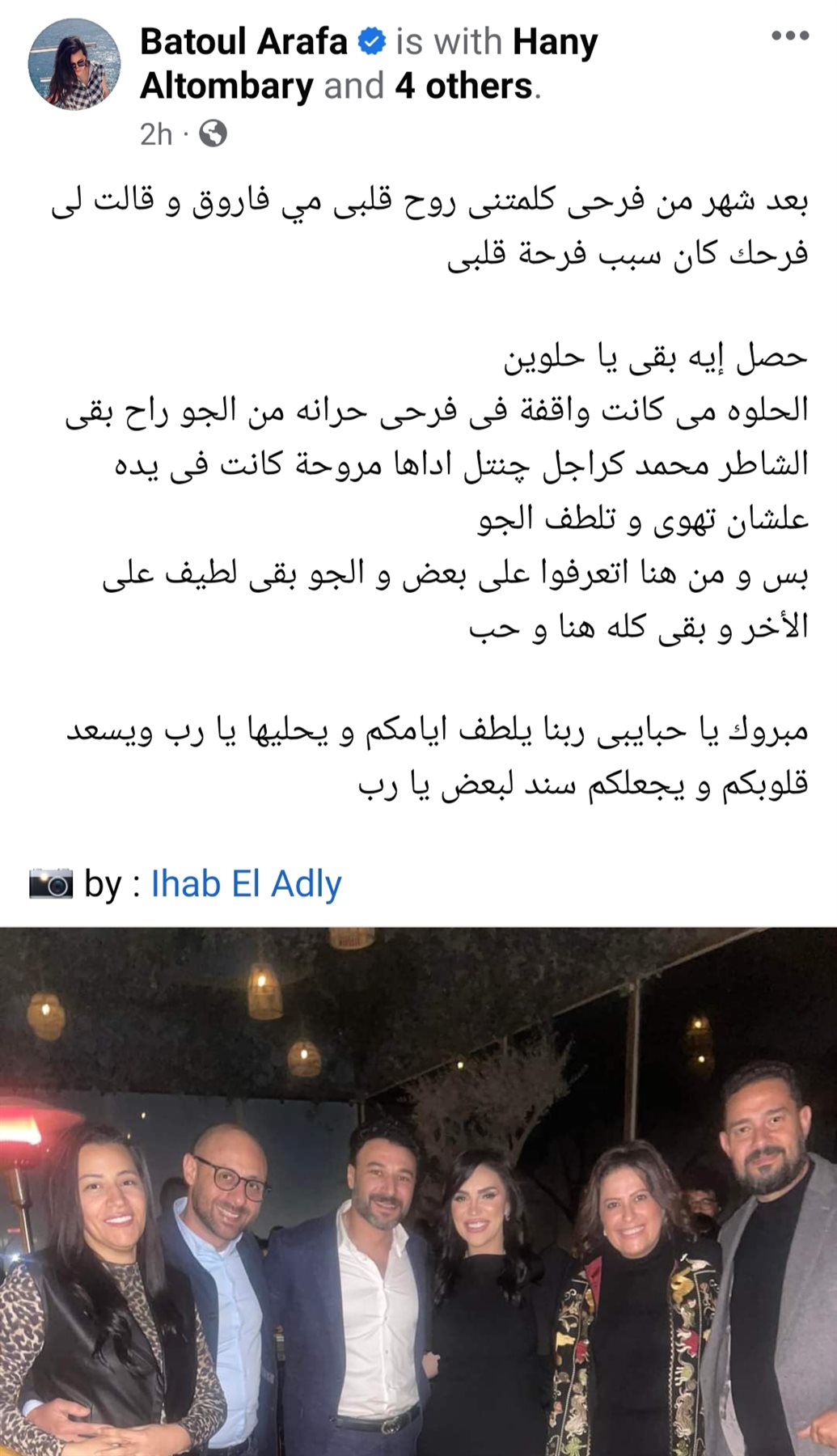 وكتبت بتول عرفة، عبر حسابها الرسمي بموقع التواصل الاجتماعي "فيسبوك" قائلا:" بعد شهر من فرحي كلمتني روح قلبي مي فاروق، وقالت لي فرحك كان سبب فرحة قلبي، حصل إيه بقى يا حلوين، الحلوة مي كانت واقفة في فرحي حرانة من الجو، راح بقى الشاطر محمد كراجل چنتل اداها مروحة، كانت في إيده علشان تهوي وتلطف الجو".