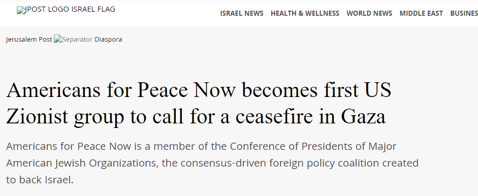 ذكرت صحيفة جيروساليم بوست الإسرائيلية أن منظمة "أمريكيون من أجل السلام الآن"، وهي منظمة يسارية مؤيدة لإسرائيل، دعت إلى وقف إطلاق النار في الحرب بين إسرائيل وحماس، لتصبح أول جماعة صهيونية أمريكية تفعل ذلك بعد أكثر من ثلاثة أشهر من القتال